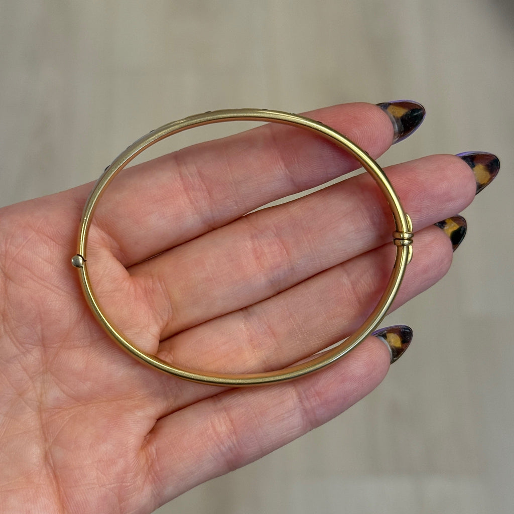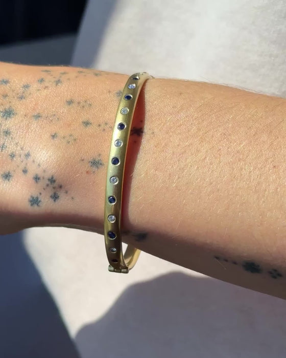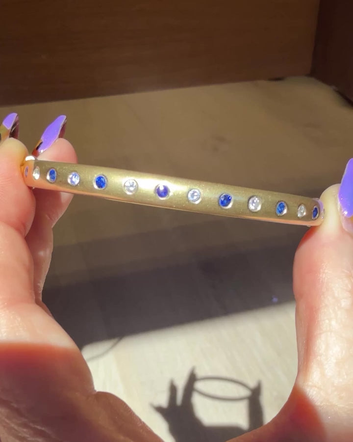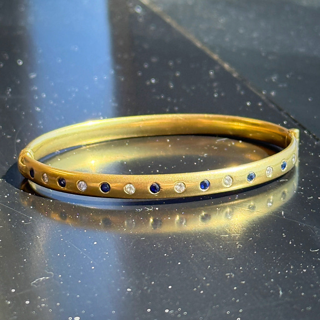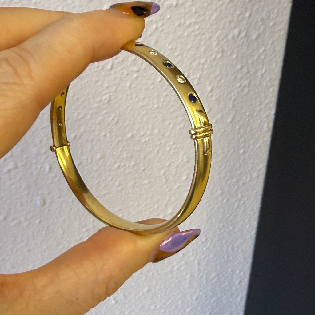 Vintage 18K Solid Yellow Gold Bangle with Flush Set Blue Sapphires and Diamonds