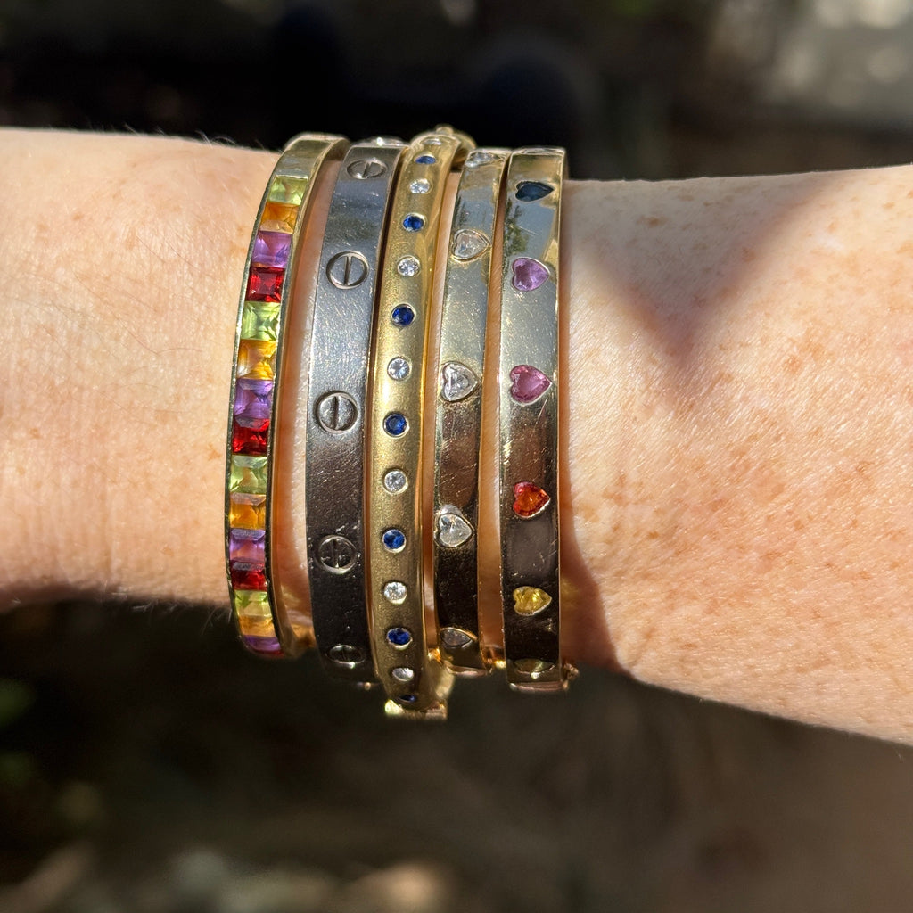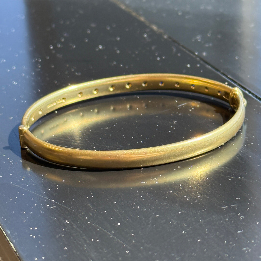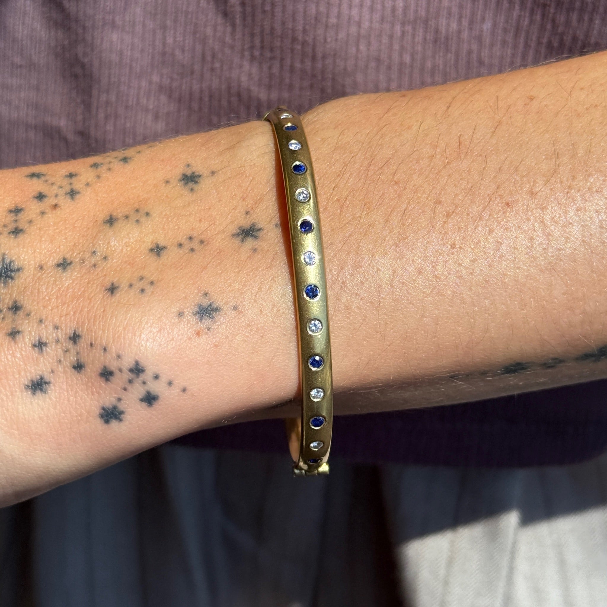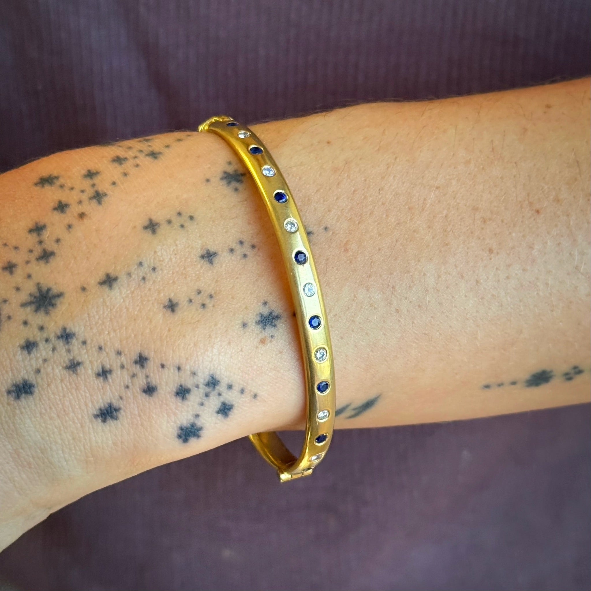 Vintage 18K Solid Yellow Gold Bangle with Flush Set Blue Sapphires and Diamonds