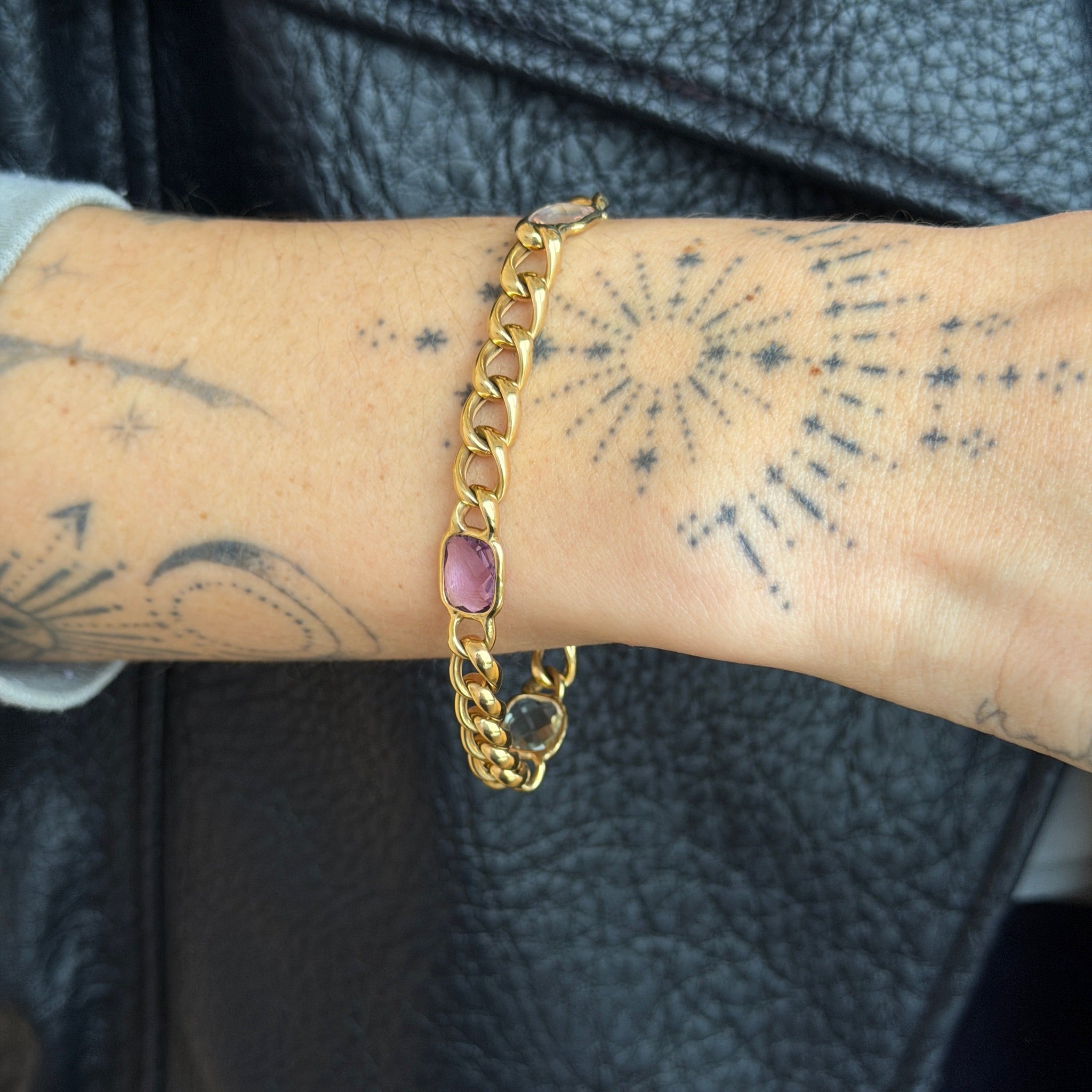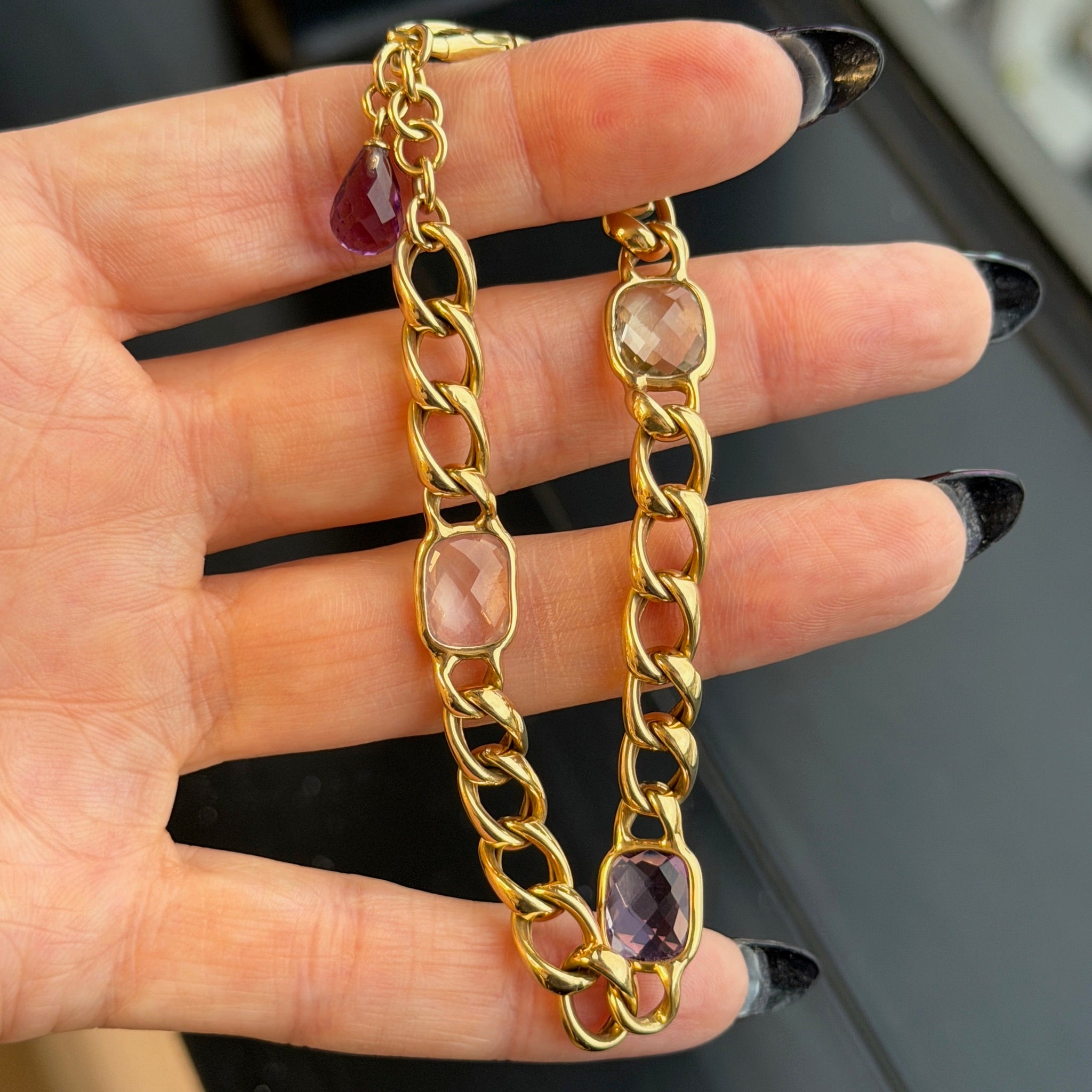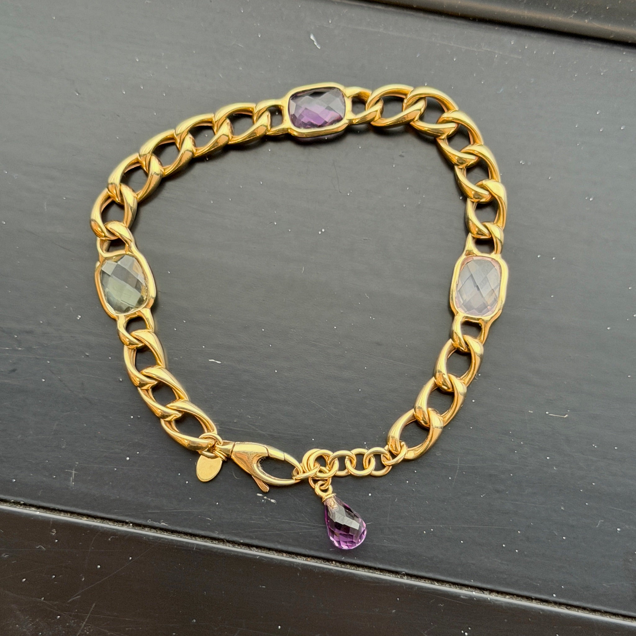 Vintage 14K Yellow Gold Curb Bracelet with Three Bezel Gemstones and an amethyst hanging off the clasp.