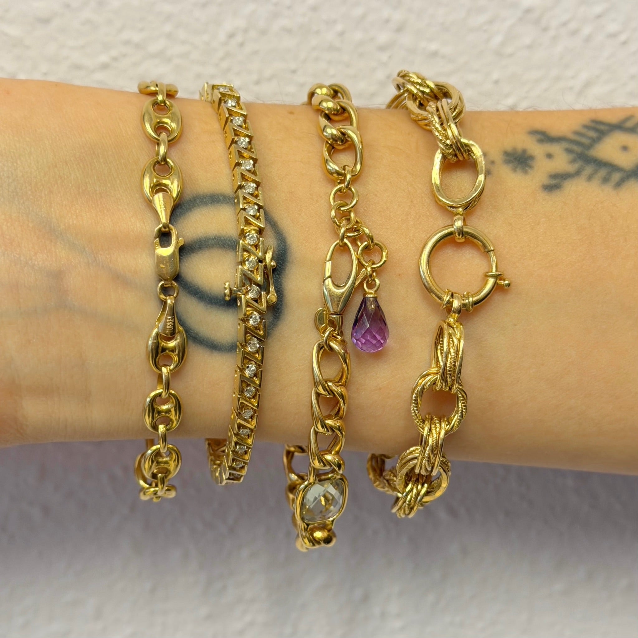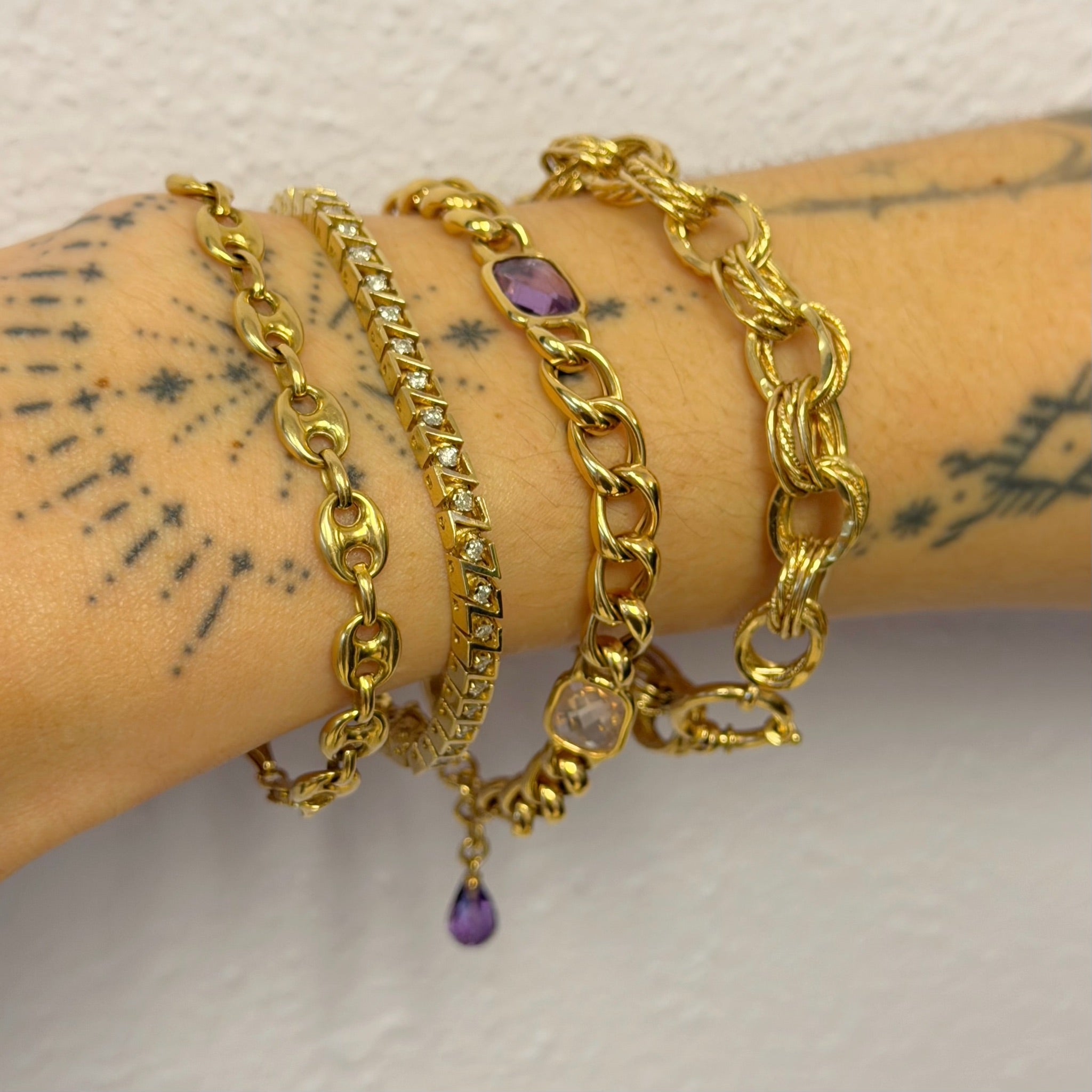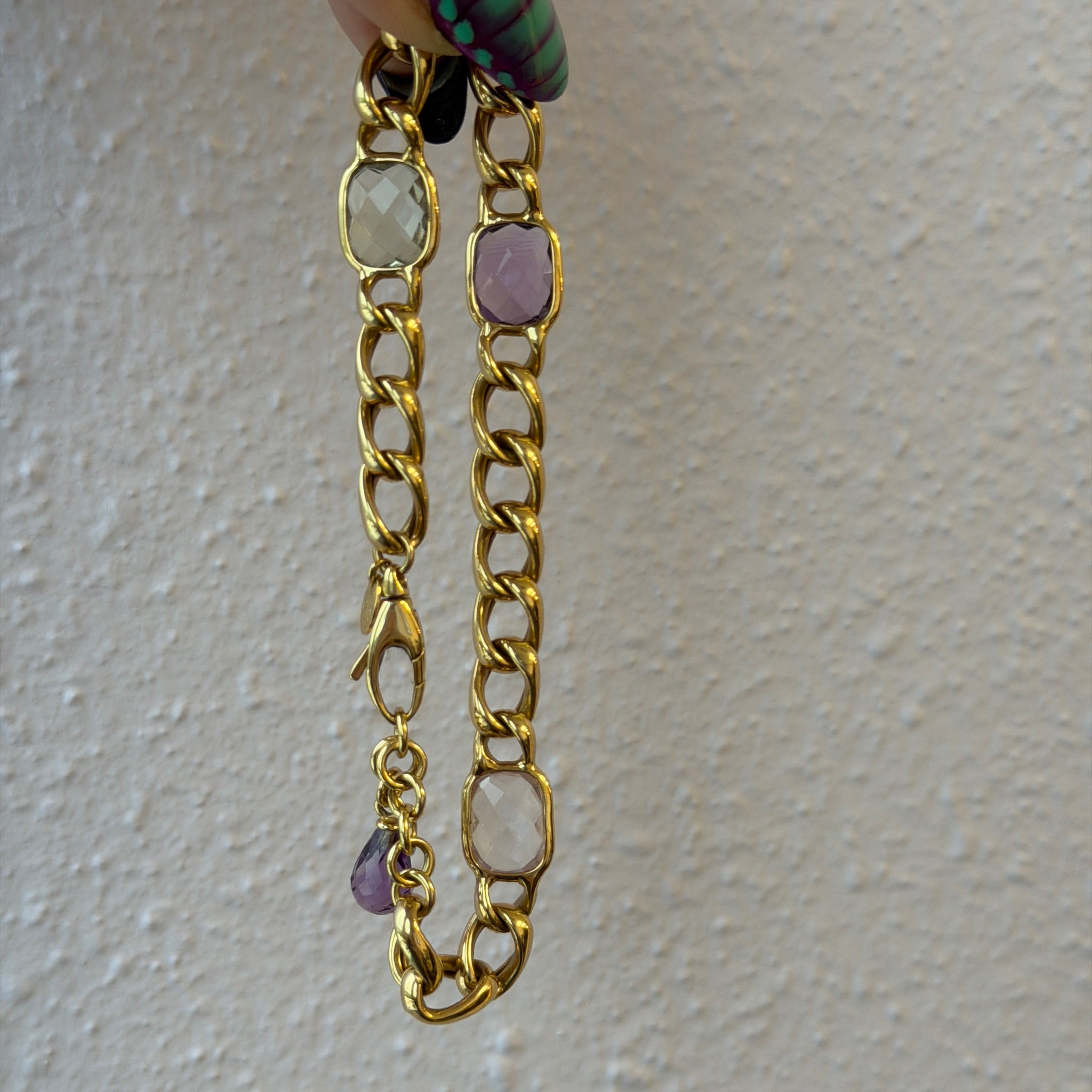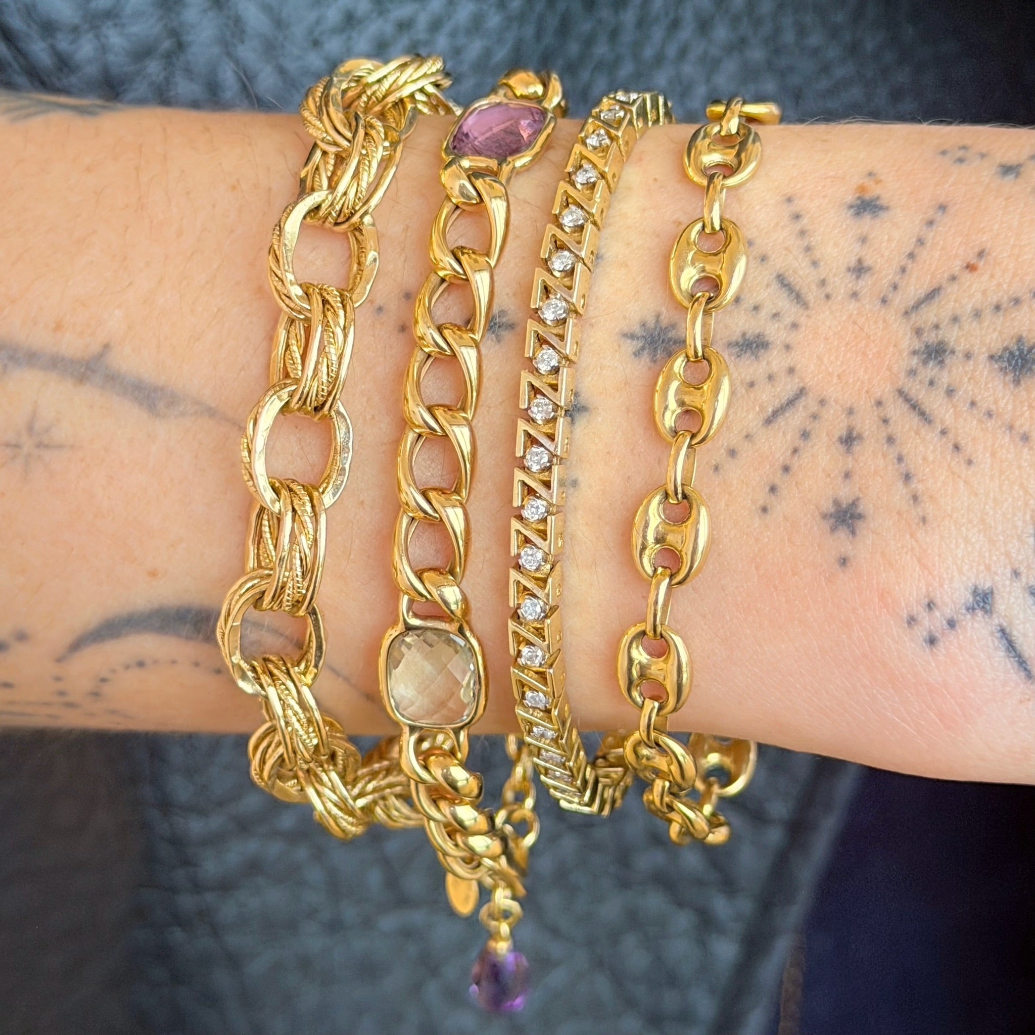 Vintage 14K Yellow Gold Curb Bracelet with Three Bezel Gemstones and an amethyst hanging off the clasp.