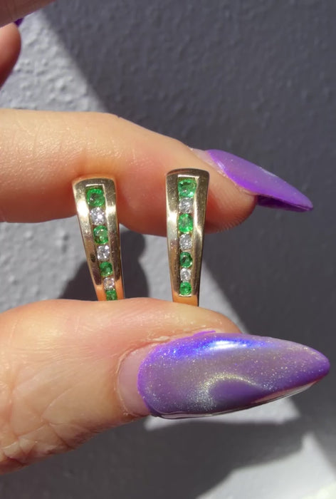 Vintage 14K Yellow Gold Emerald and Diamond Huggies Shaped liked Hearts