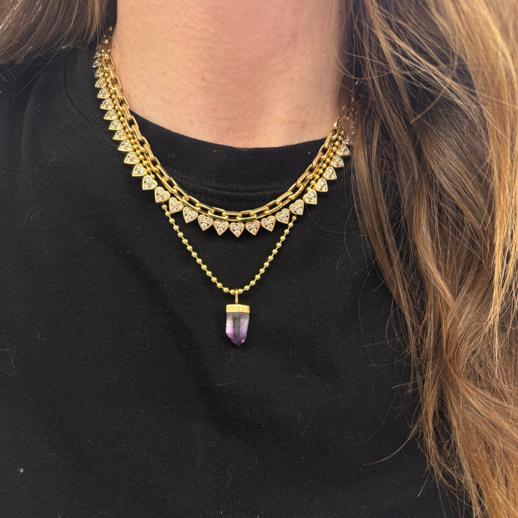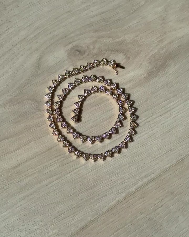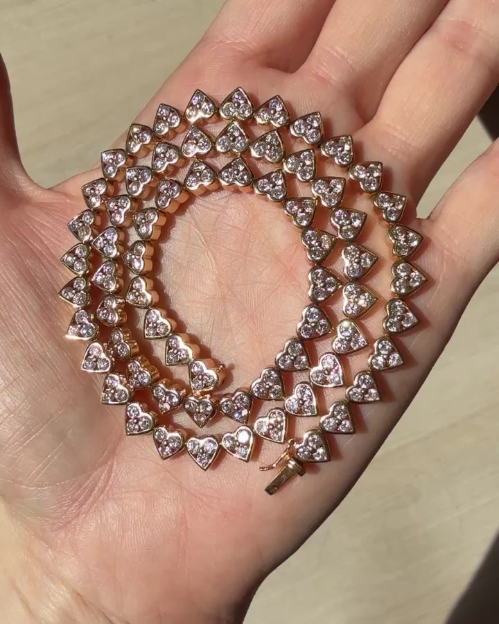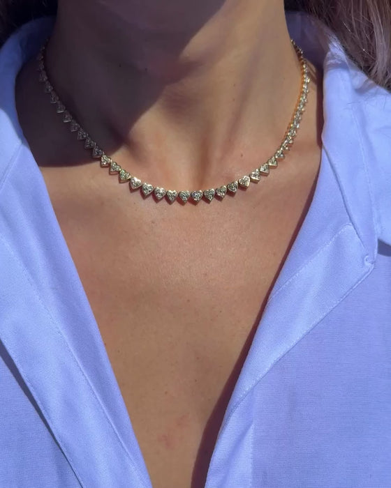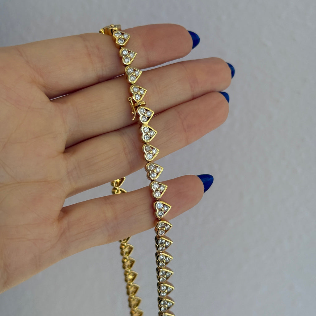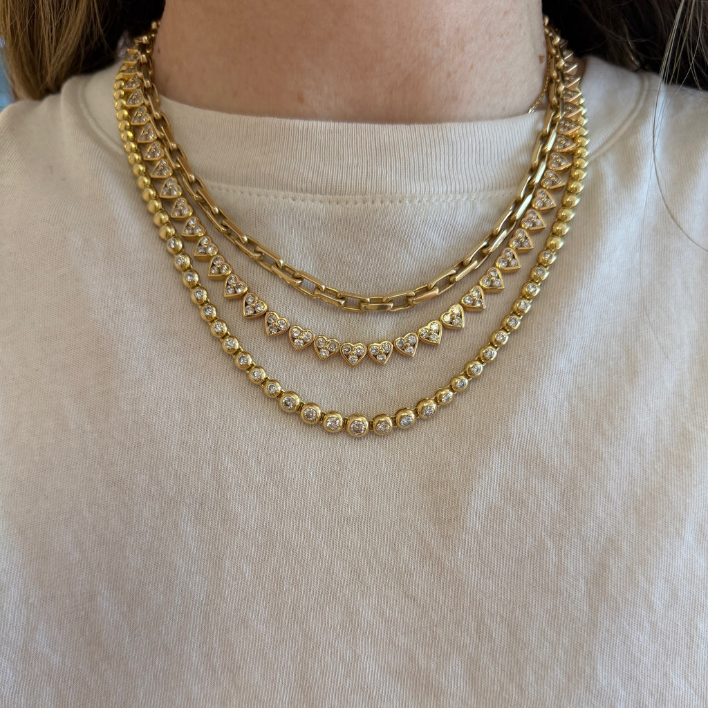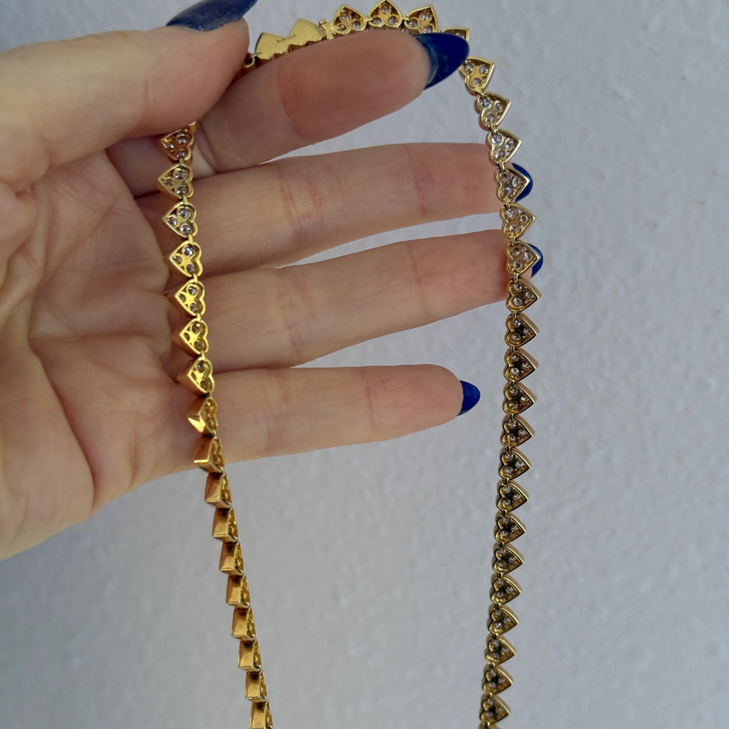 The Heart necklace of your dreams- Estate 18K Yellow Gold Diamond Bezel Heart Tennis Necklace. It's a great length, perfect for layering or shining solo.