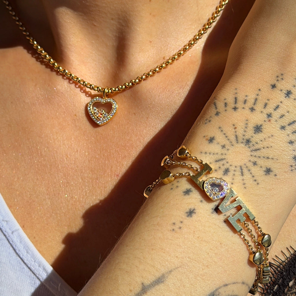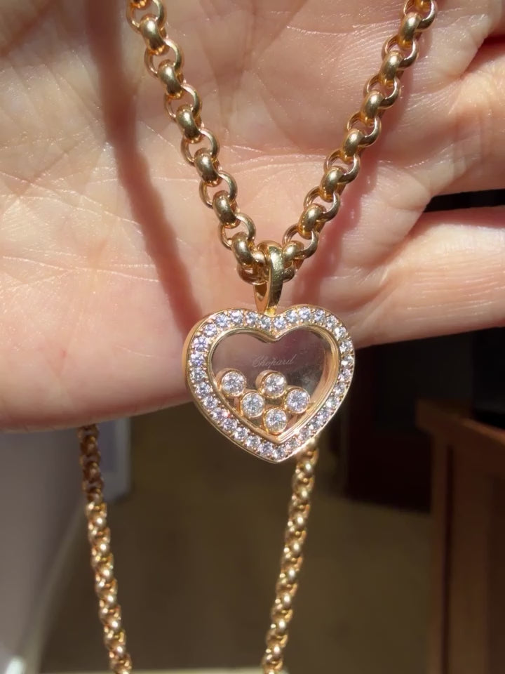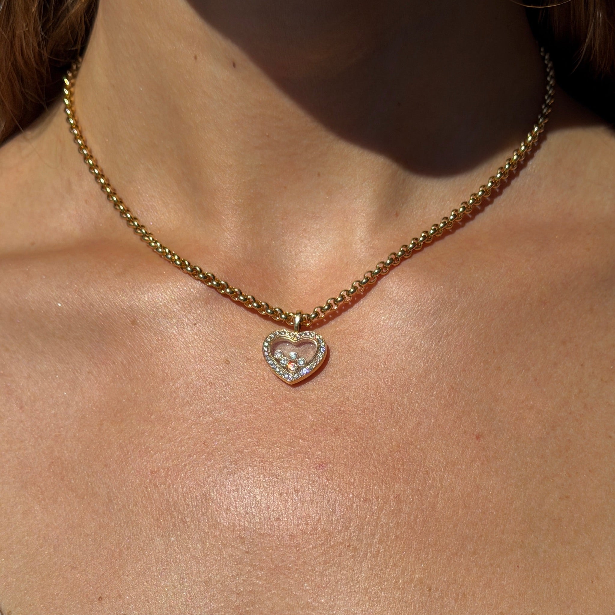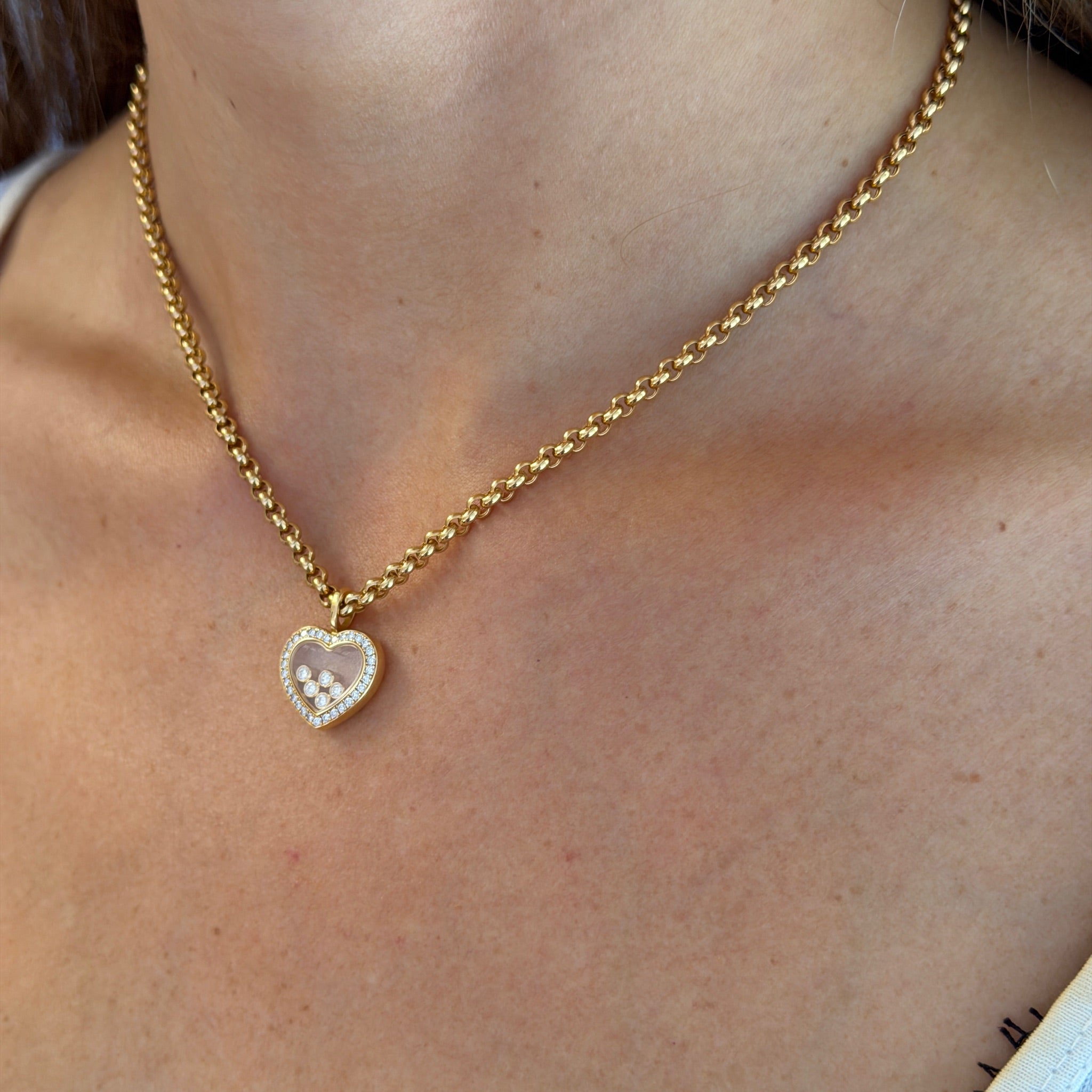 This necklace features five stunning floating diamonds that sparkle endlessly within a beautifully crafted heart-shaped pendant hanging off a solid 18K Rolo Chain.