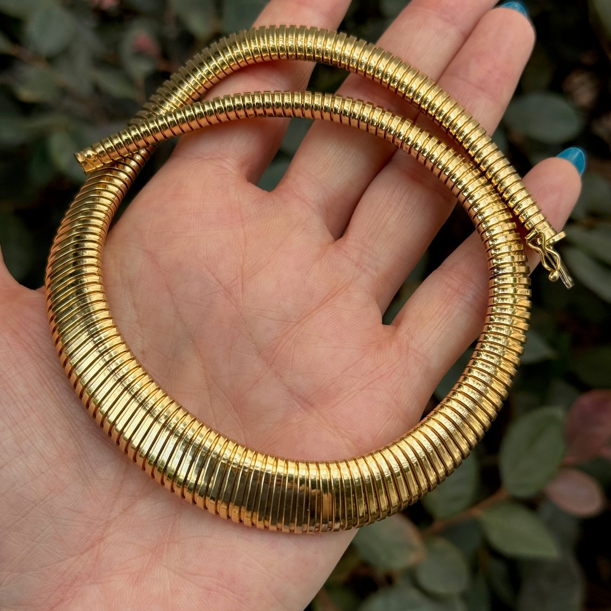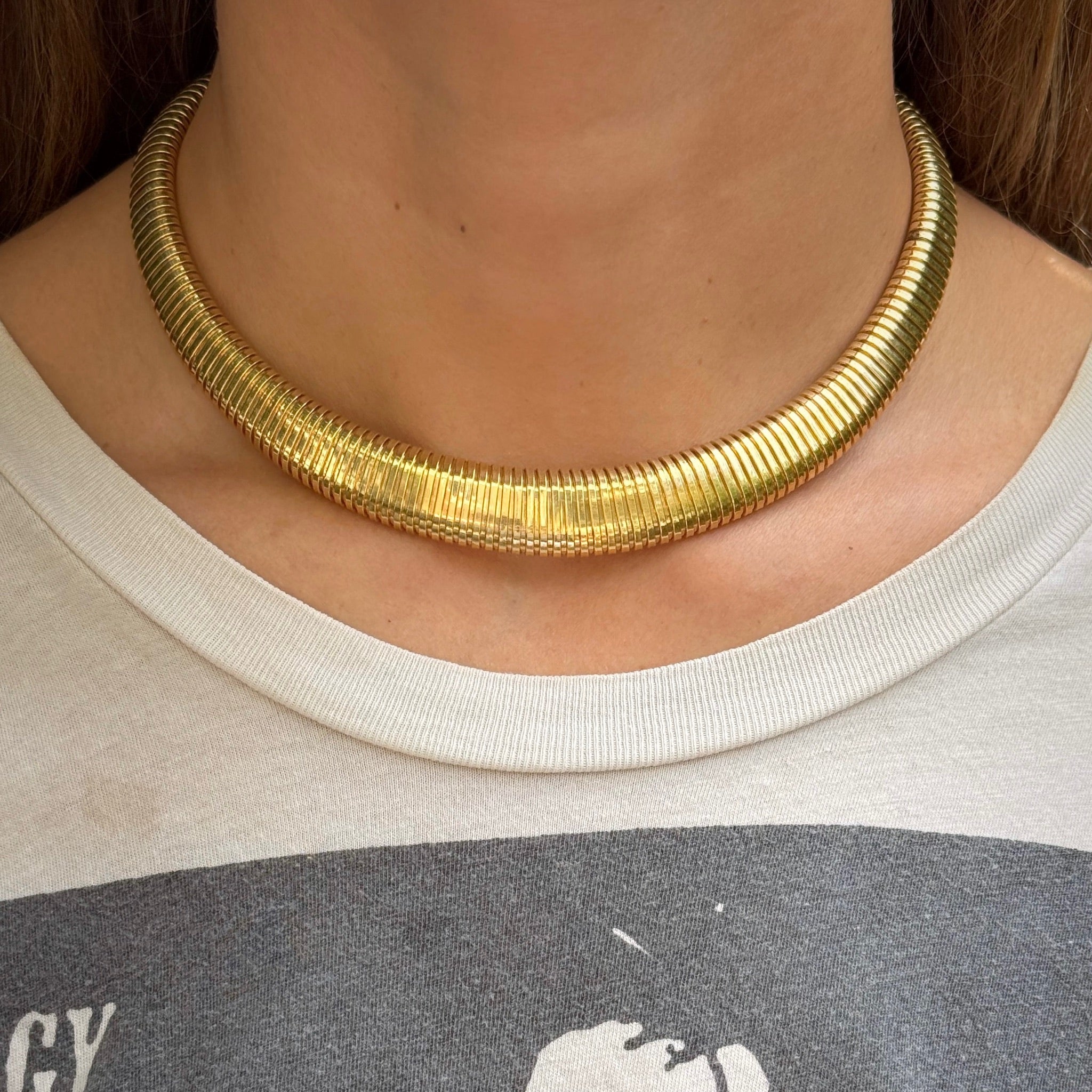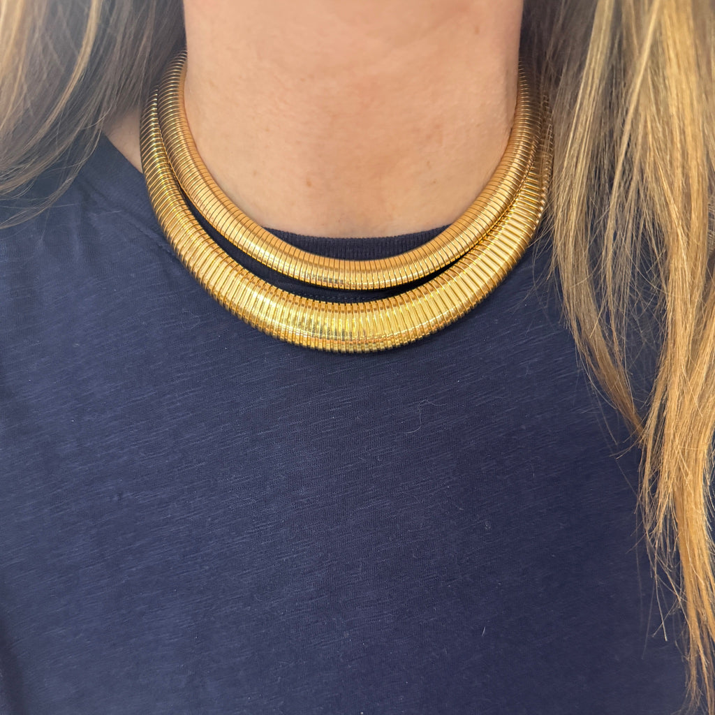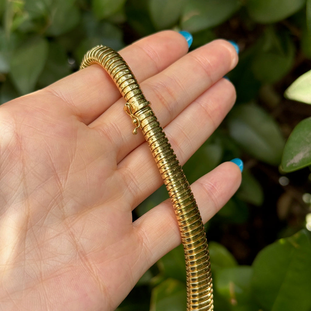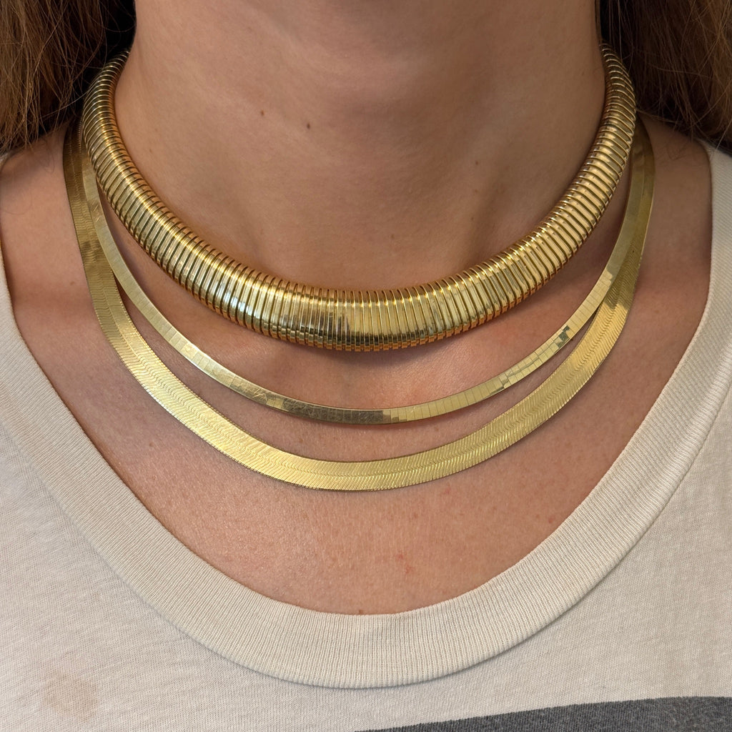 We always love a vintage tubogas necklace, especially a graduated one. Such a timeless piece that always looks chic and great on everyone. Wear it alone for a "one and done" or stack it with some other chains for a look that's sure to turn heads.