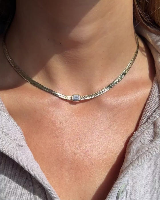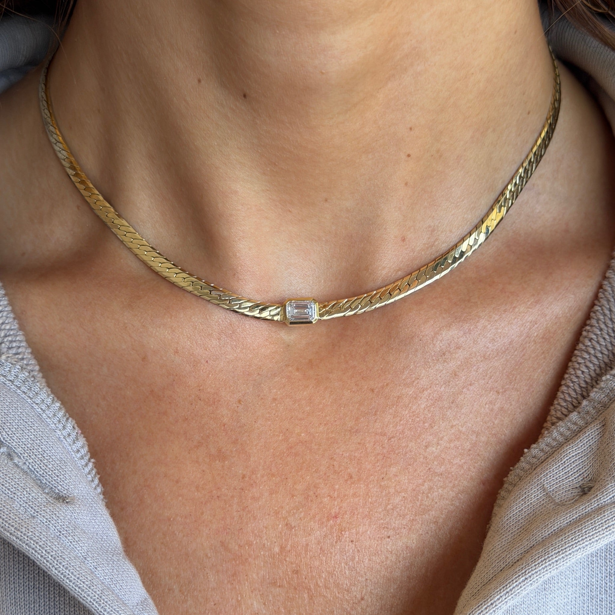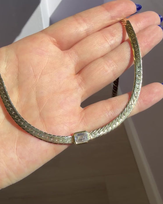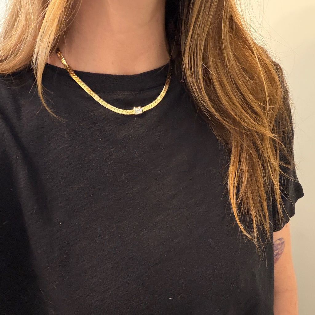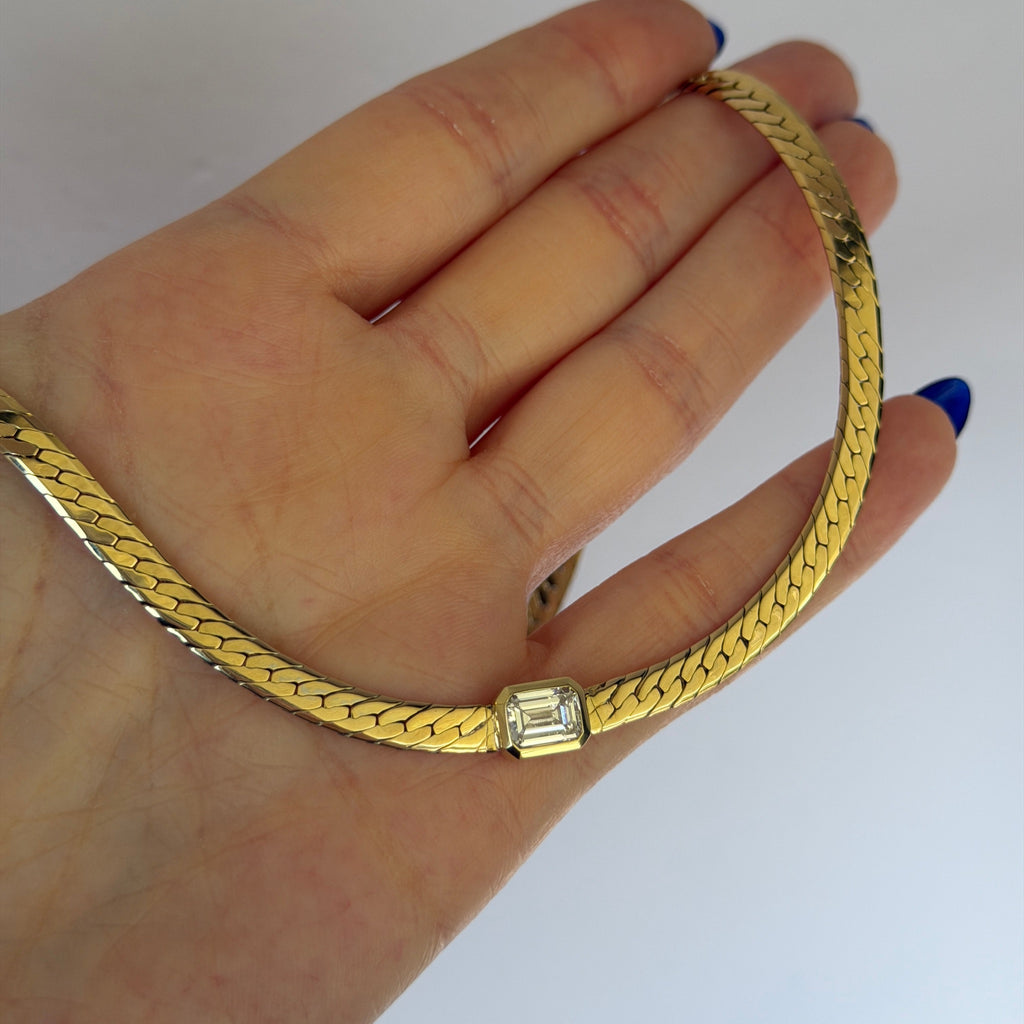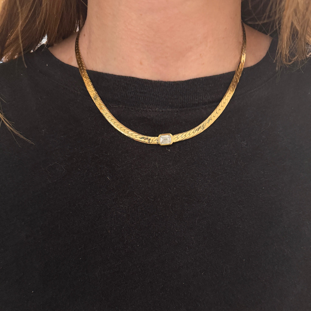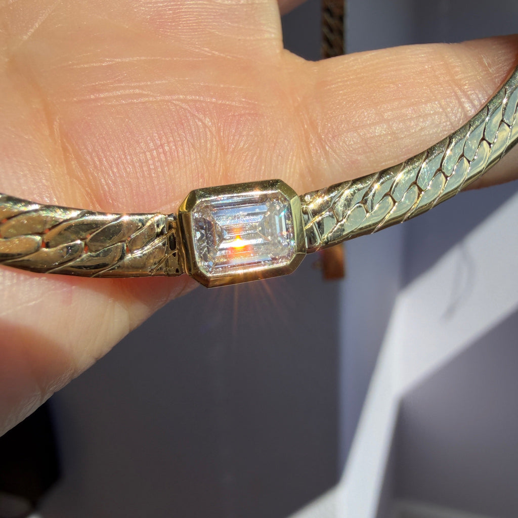18K Vintage Herringbone with Bezel-Set Emerald Cut Diamond