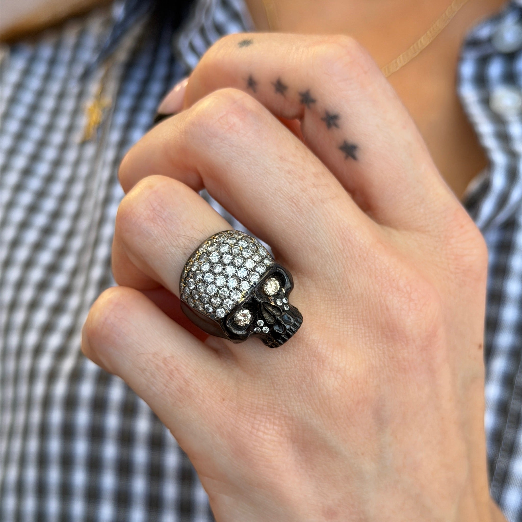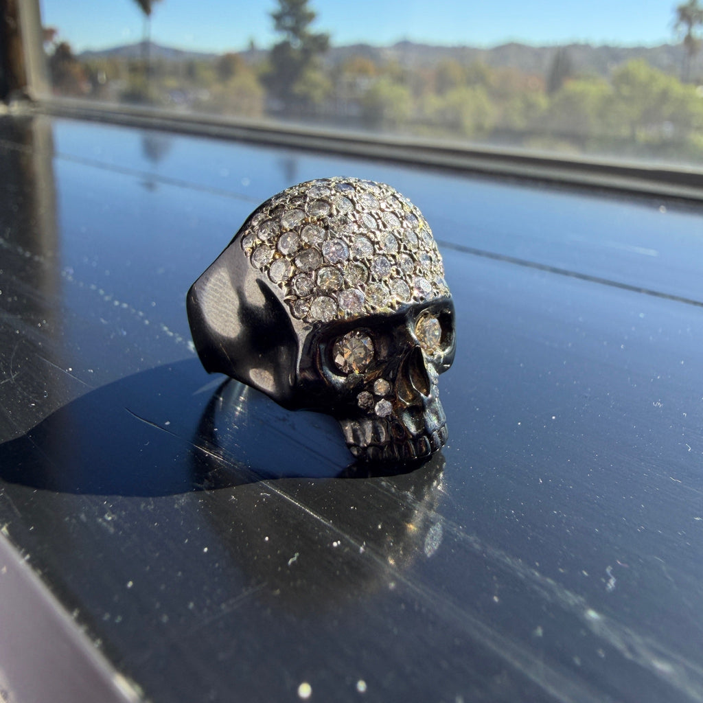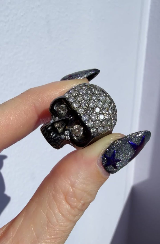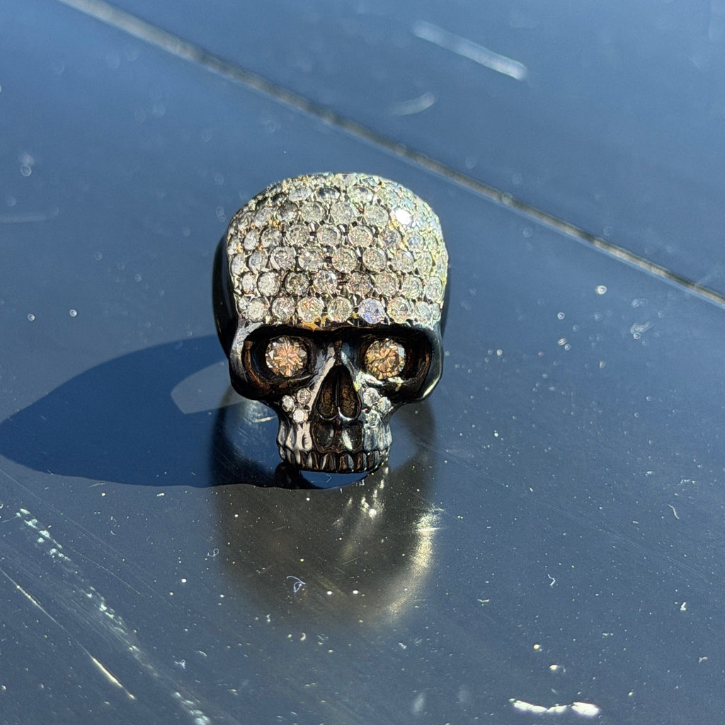 Vintage 18K Yellow Gold Skull Ring with Diamonds and Black Rhodium