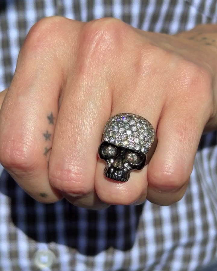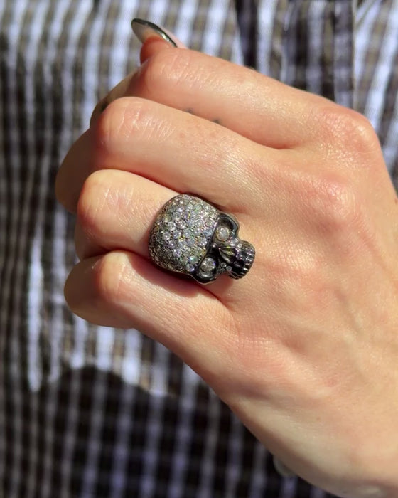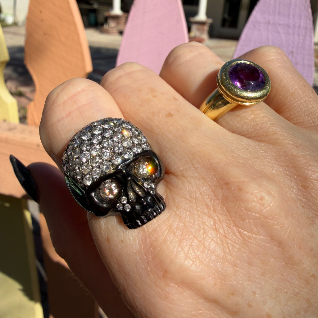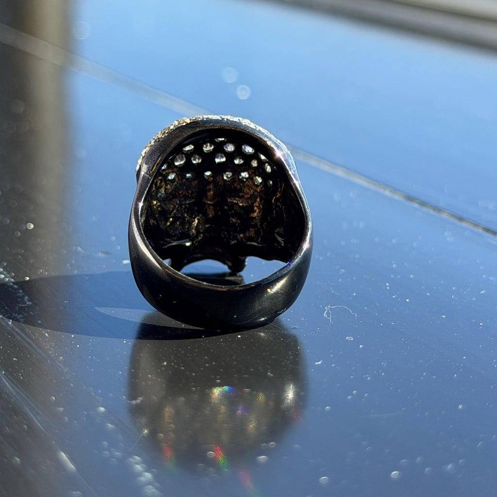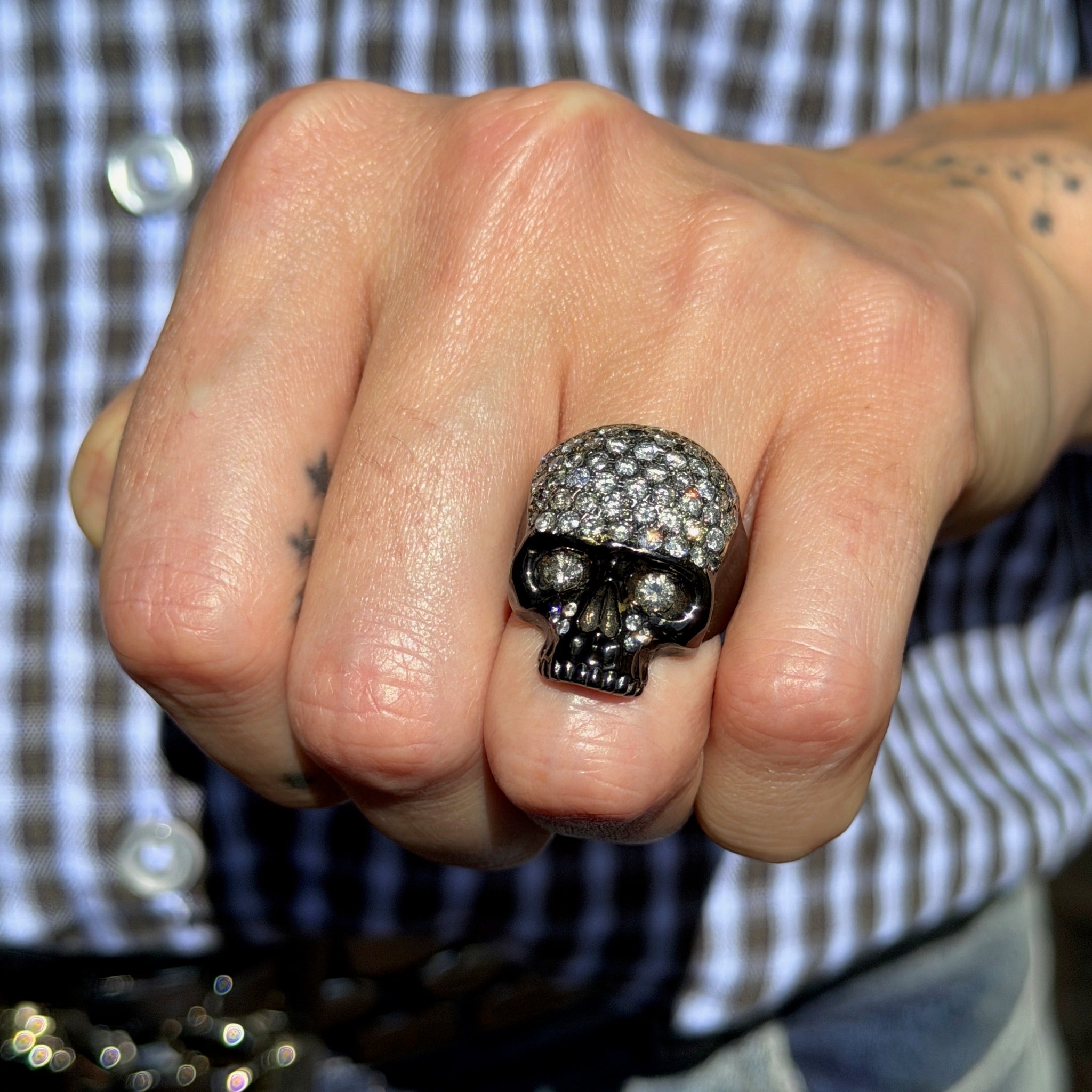 Vintage 18K Yellow Gold Skull Ring with Diamonds and Black Rhodium