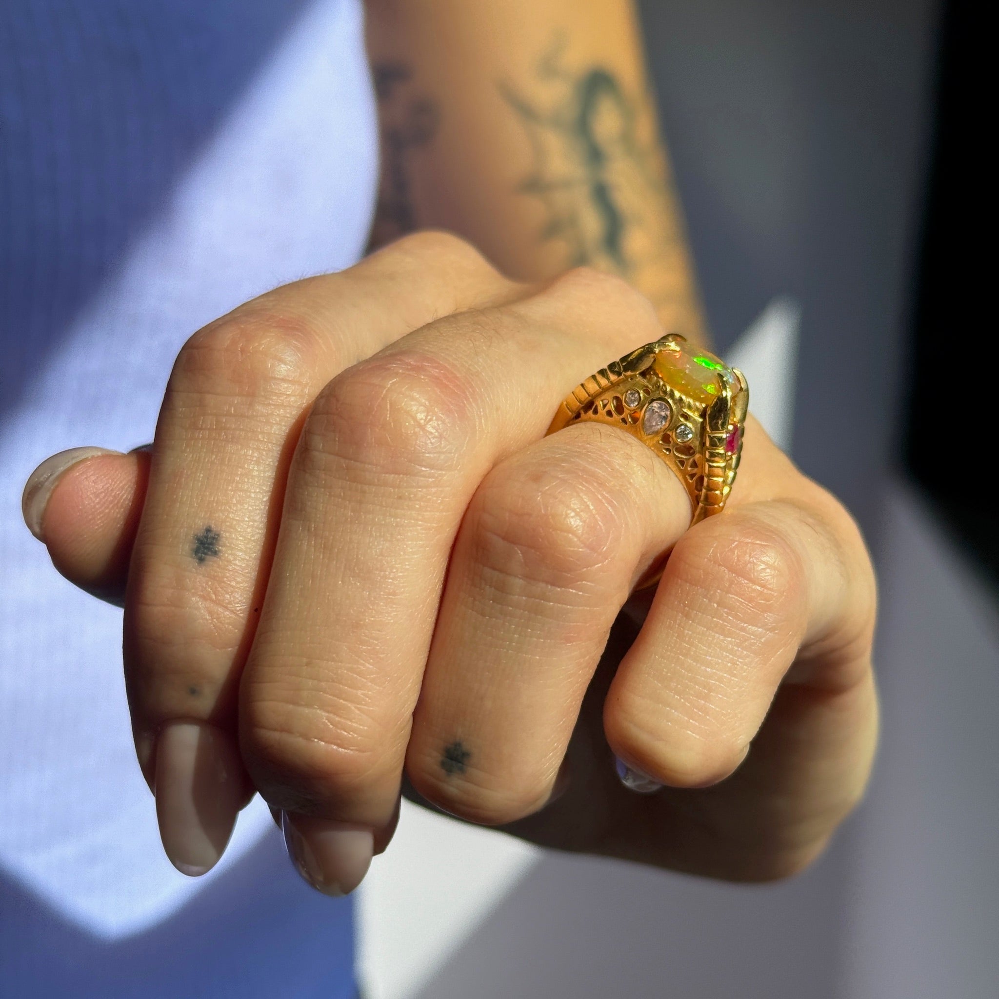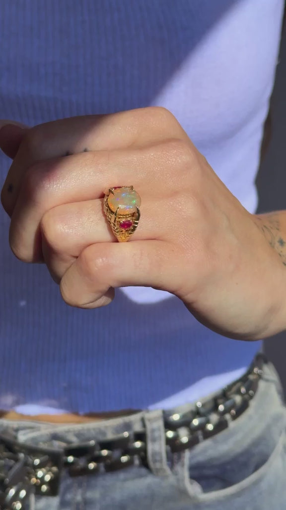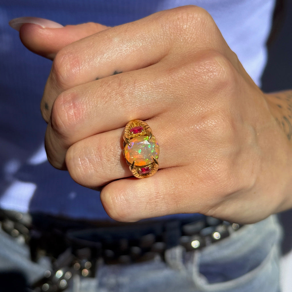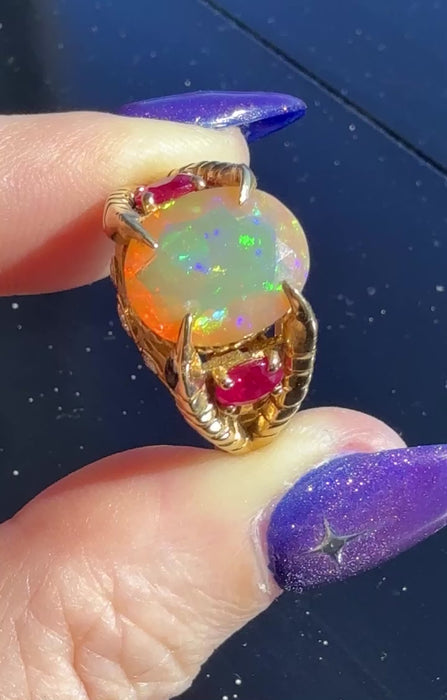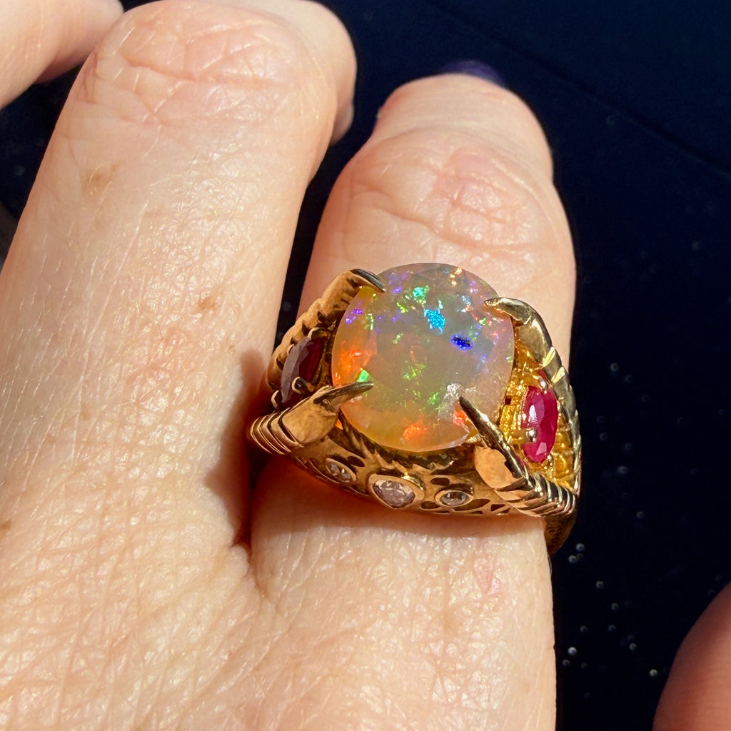 18K Yellow Gold Claw Ring with Ethiopian Opal, Rubies and Diamonds