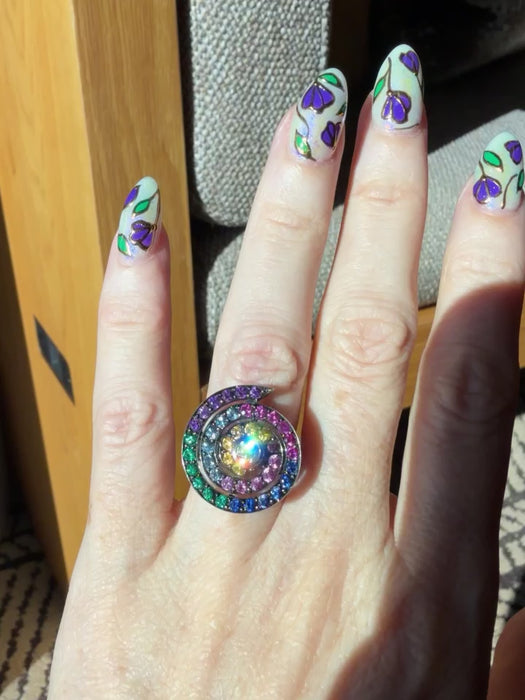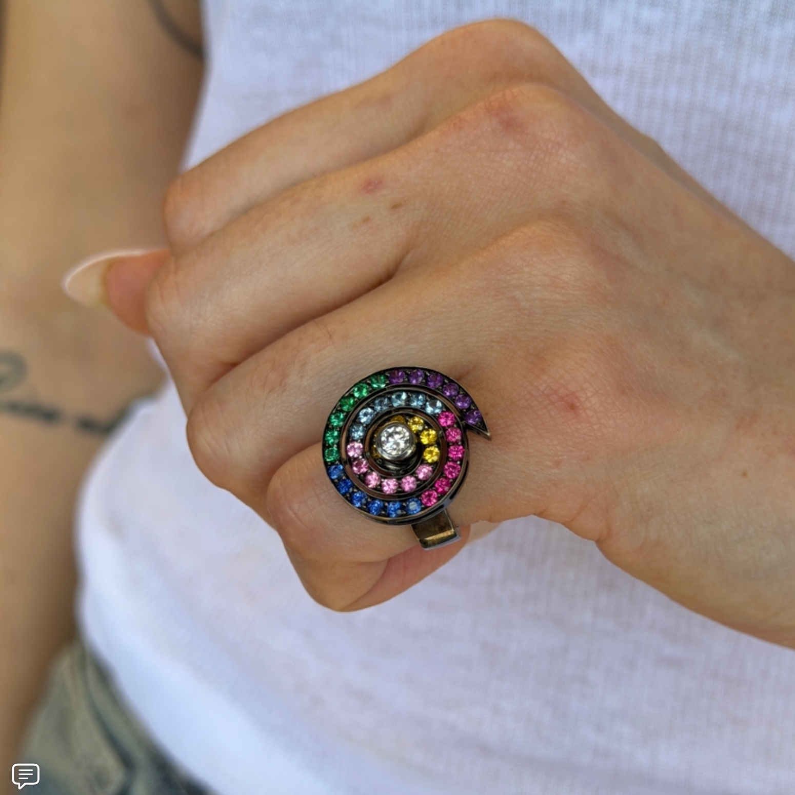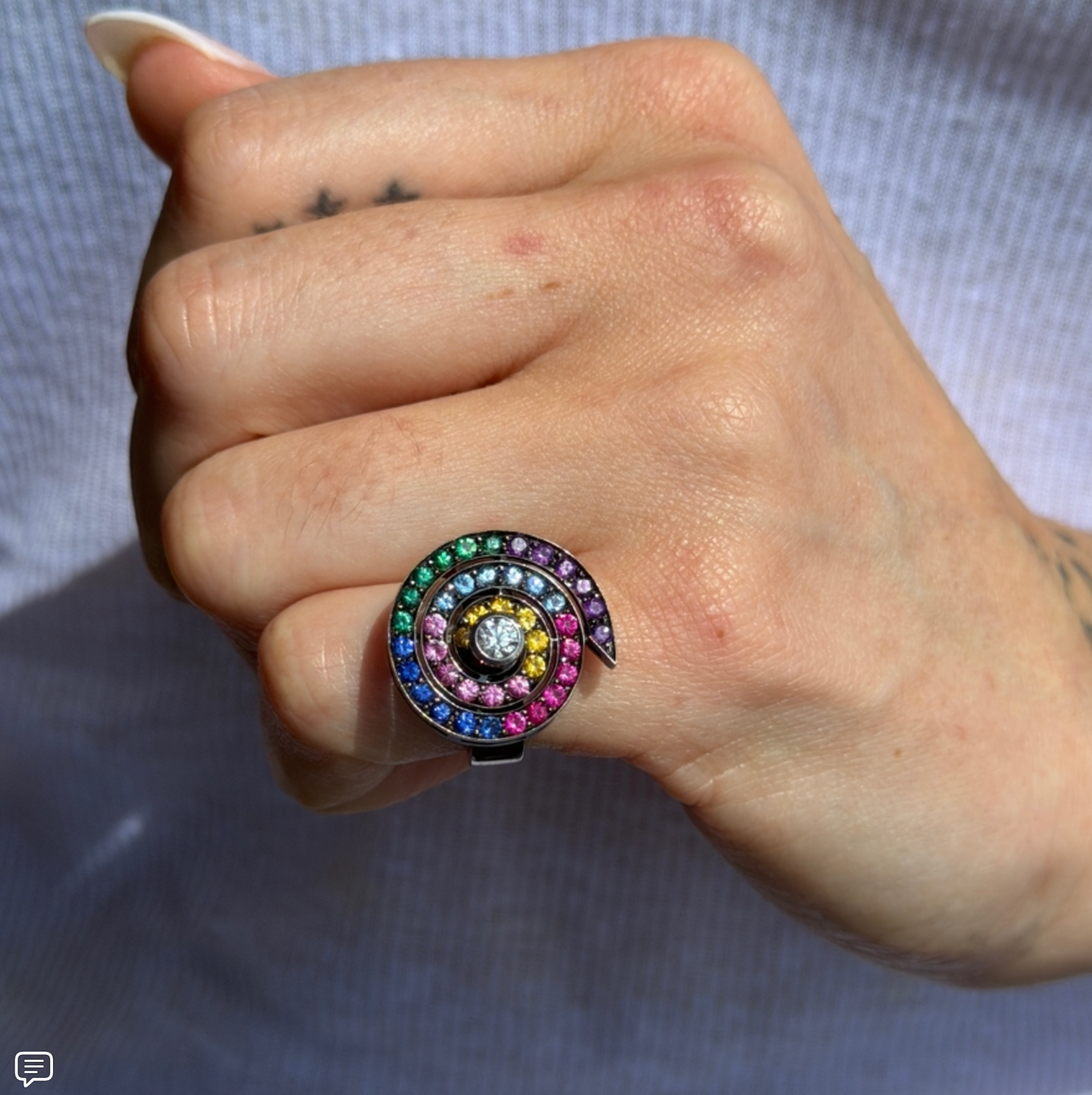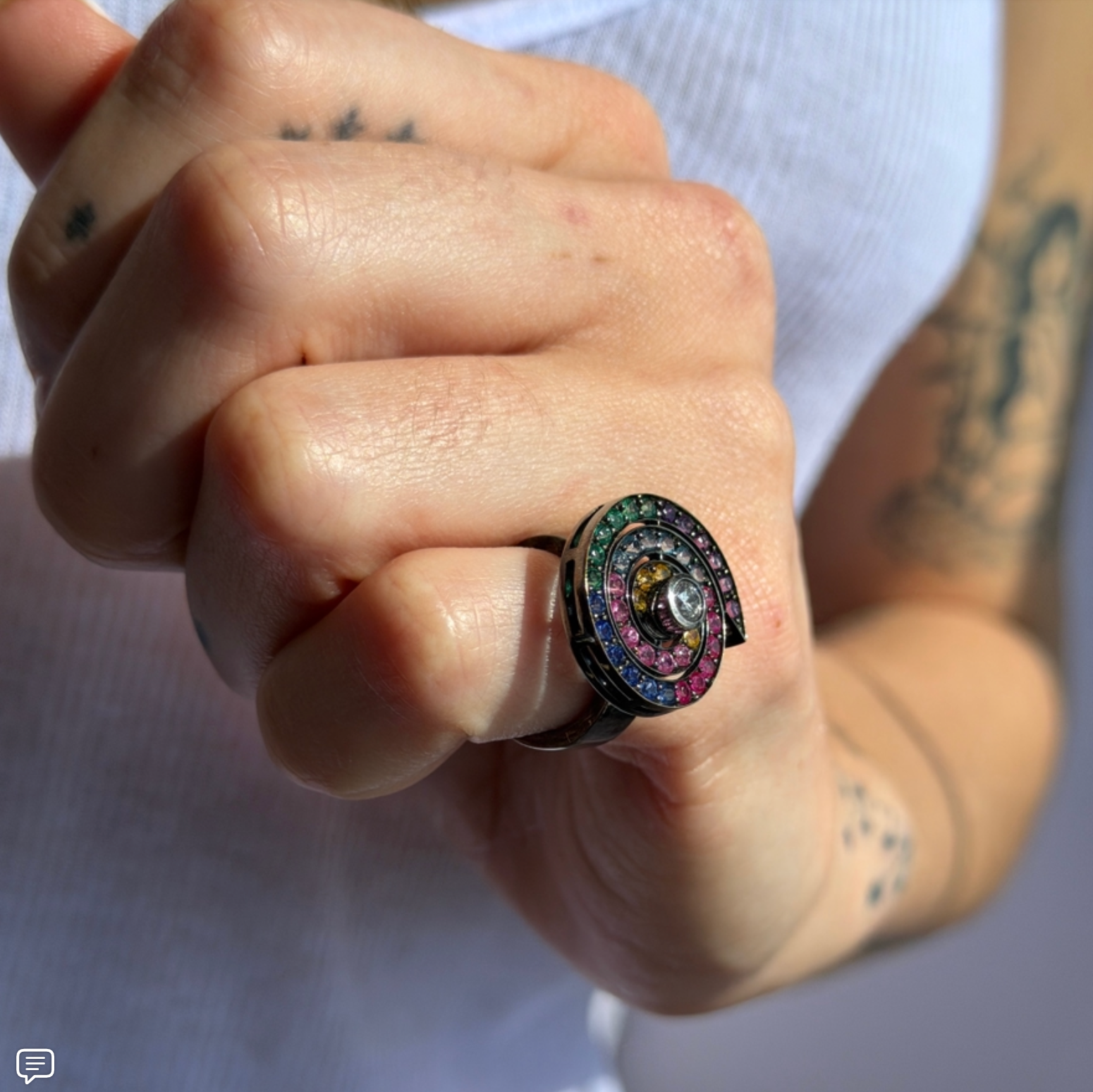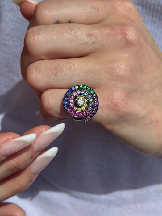 18K Blackened Gold Round Rainbow Spinner Ring by British designer Solange Azagury-Partridge features a spinning spiral of vibrant gemstones aroun a center diamond. A fidget spinner for your hand.
