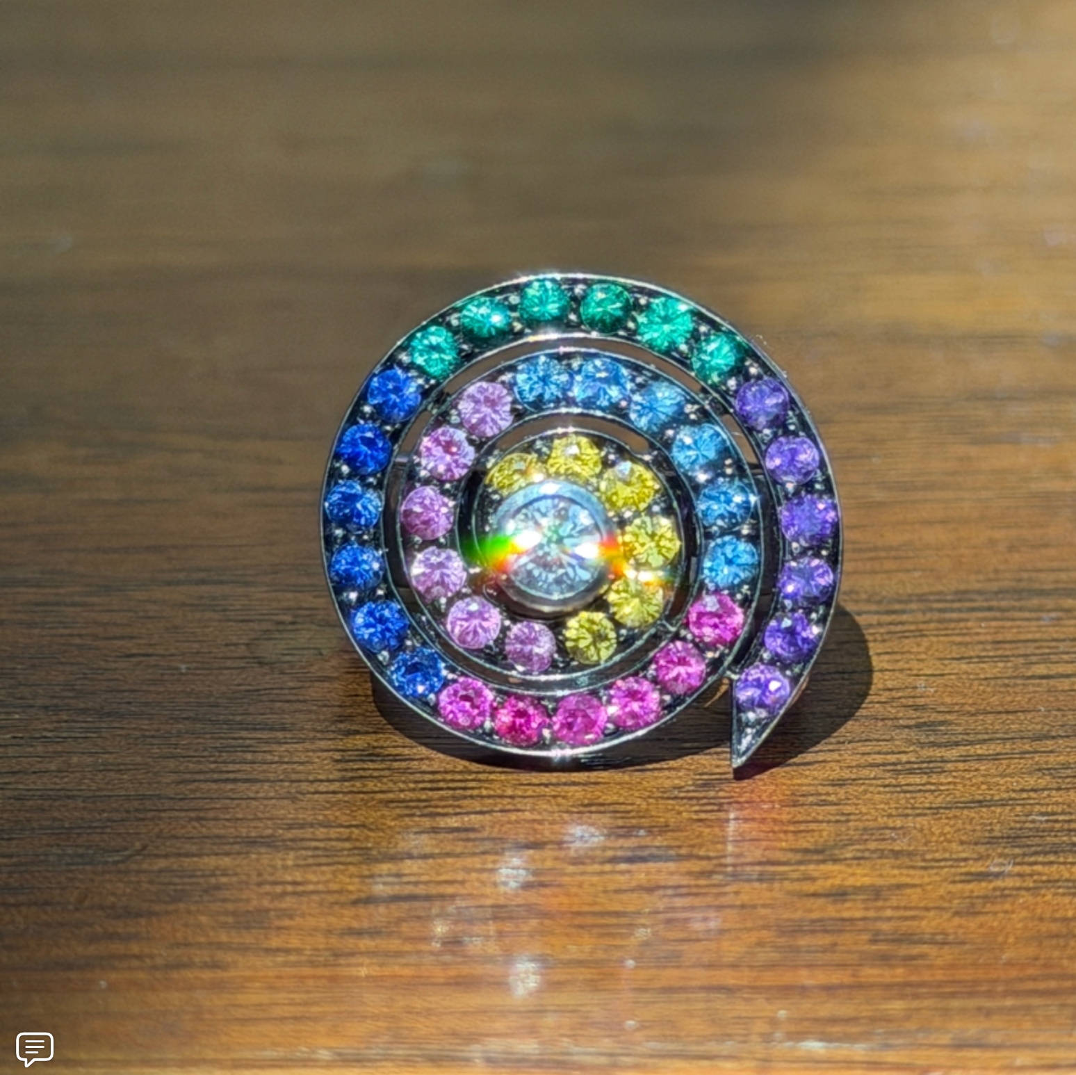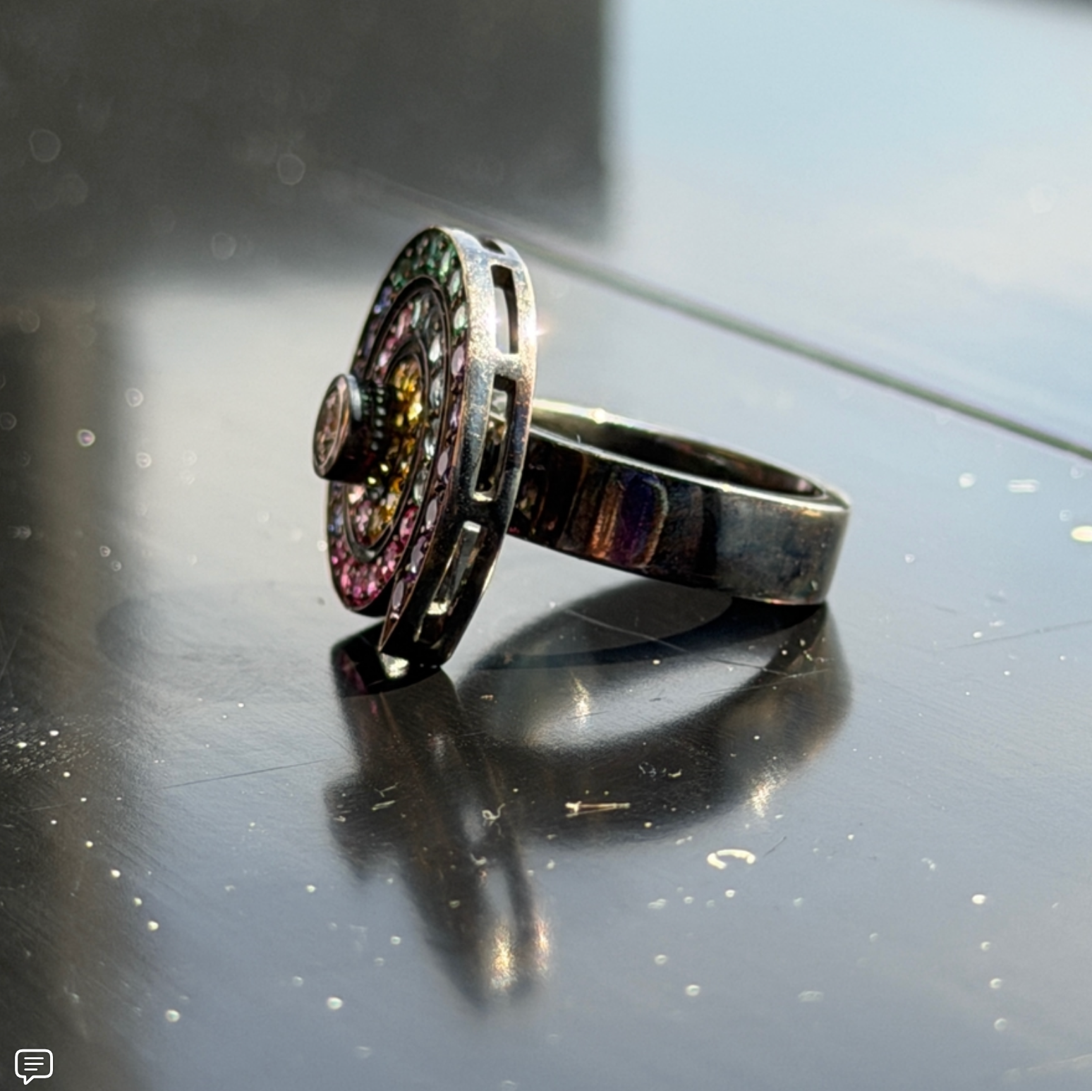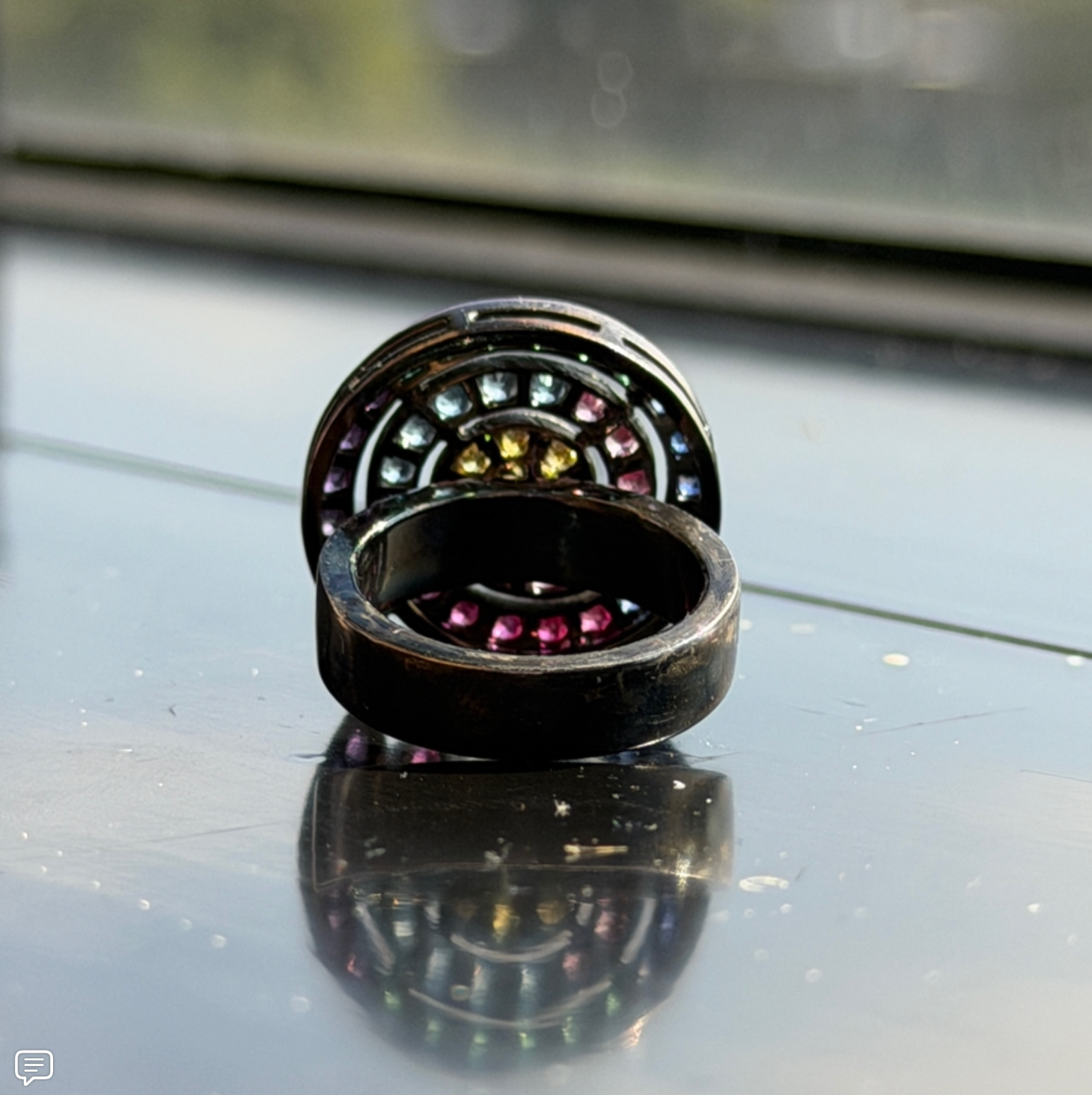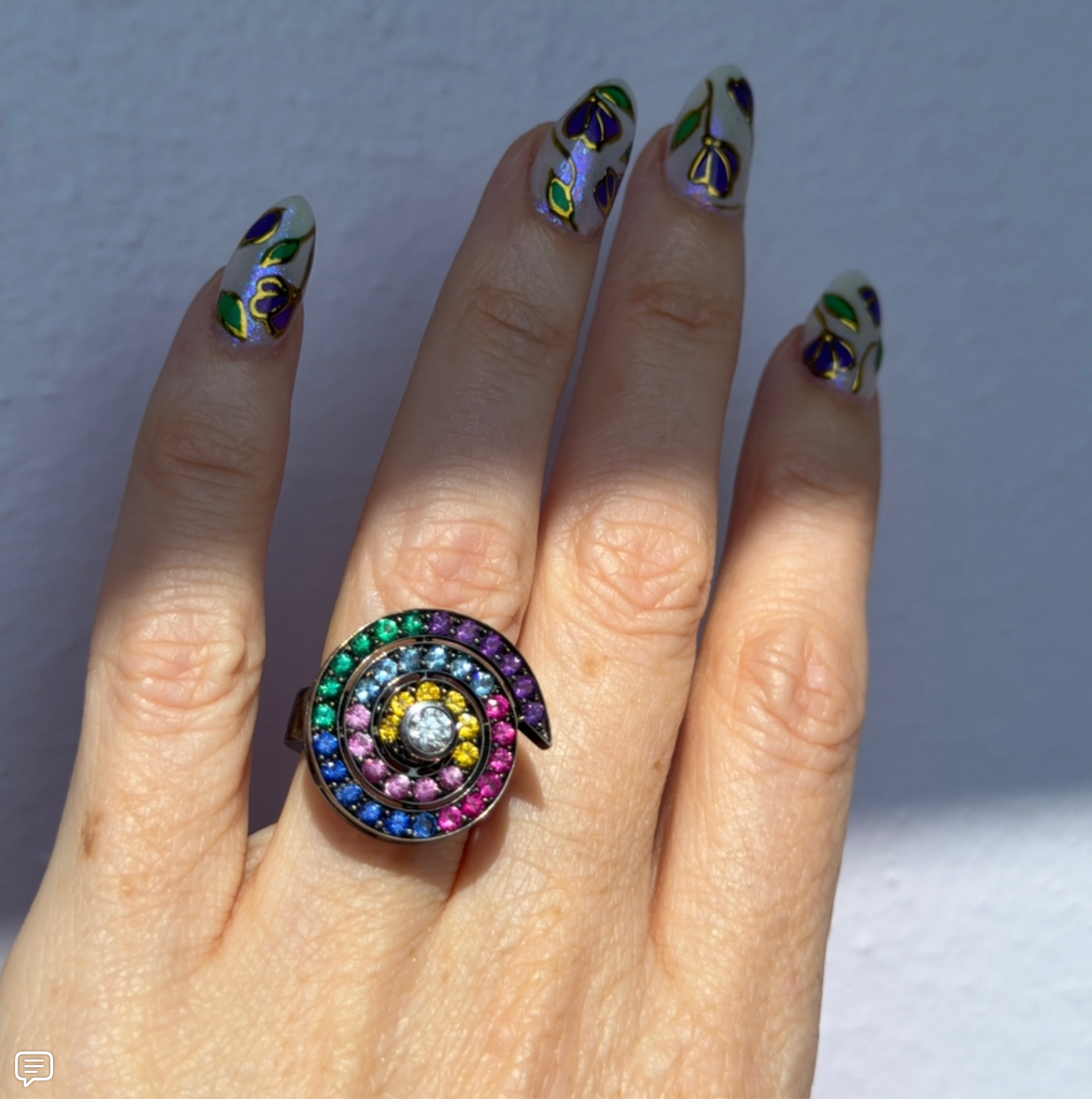 18K Blackened Gold Round Rainbow Spinner Ring by British designer Solange Azagury-Partridge features a spinning spiral of vibrant gemstones aroun a center diamond. A fidget spinner for your hand.