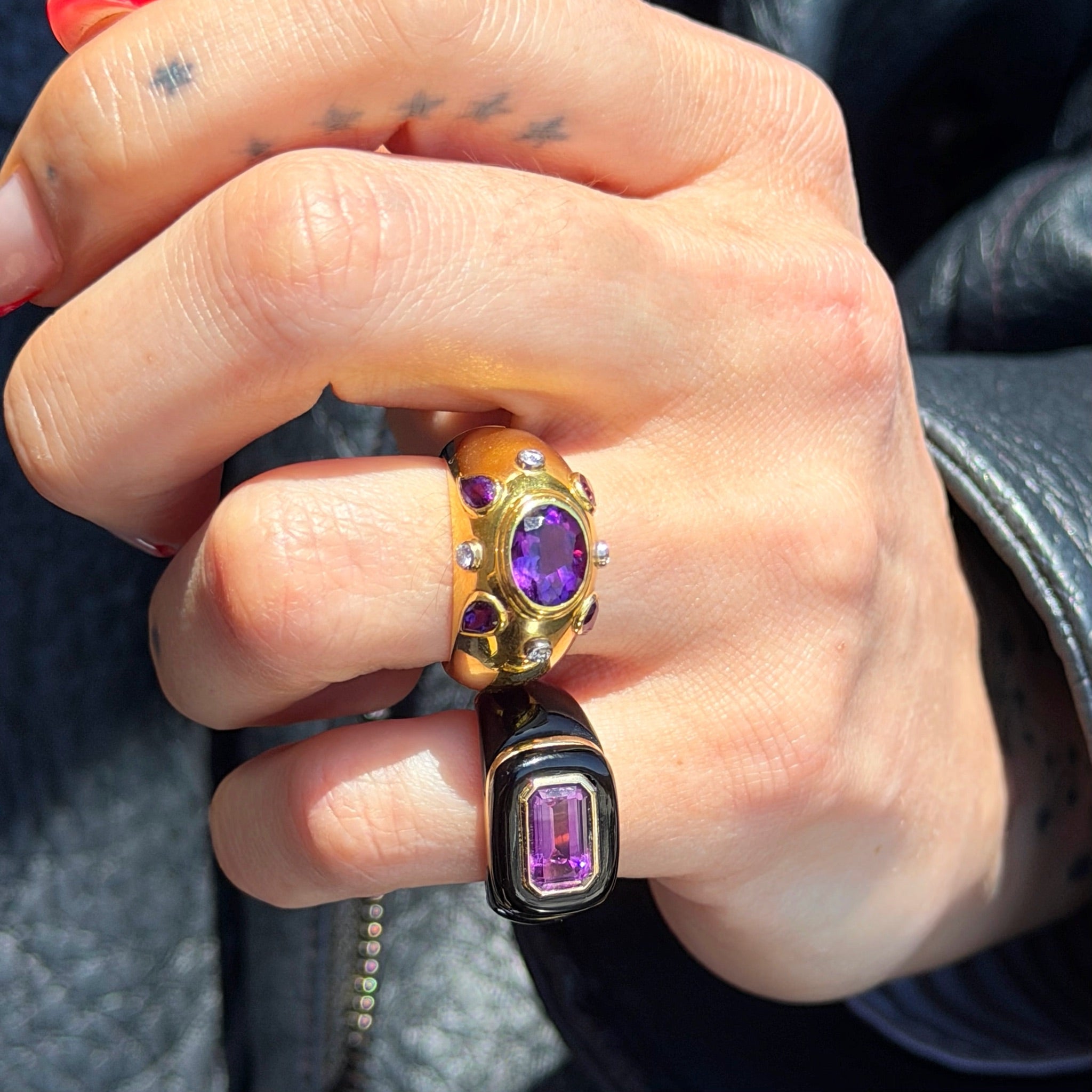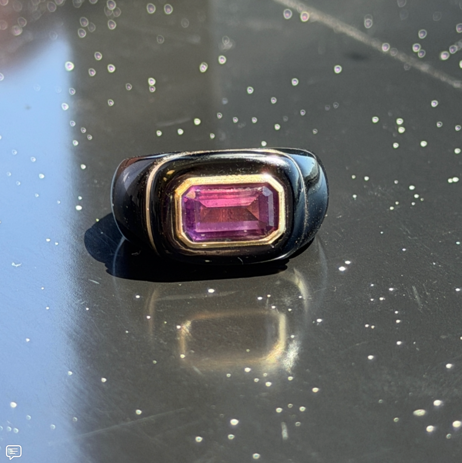 Vintage 14K Yellow Gold Emerald Cut Amethyst and Inlay Onyx Ring