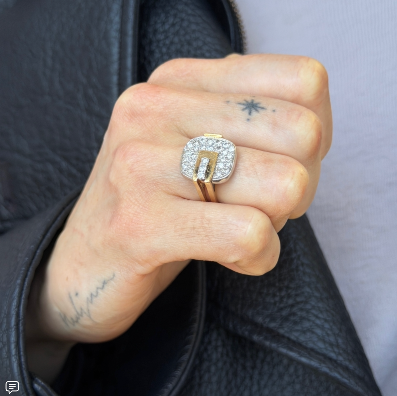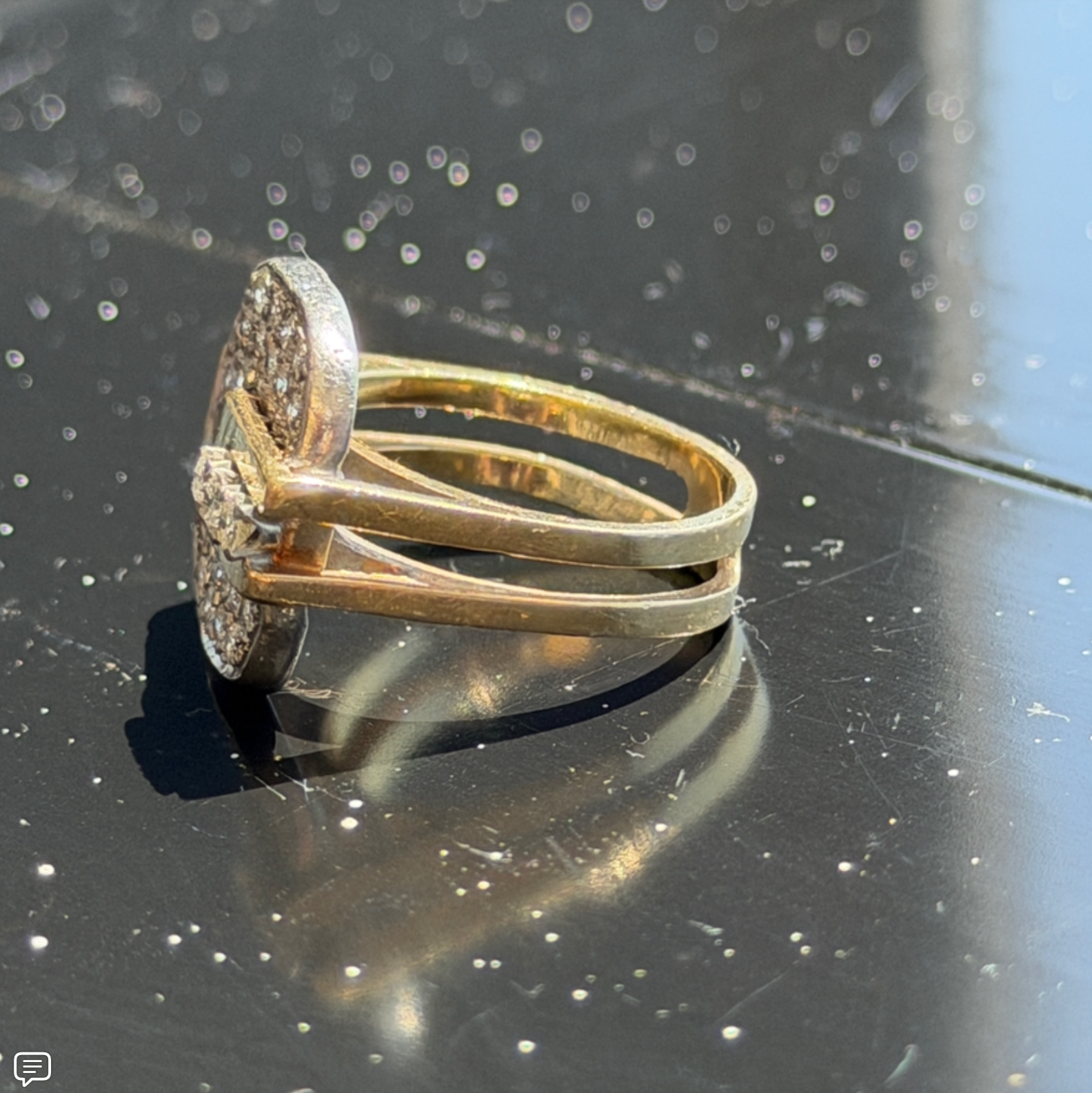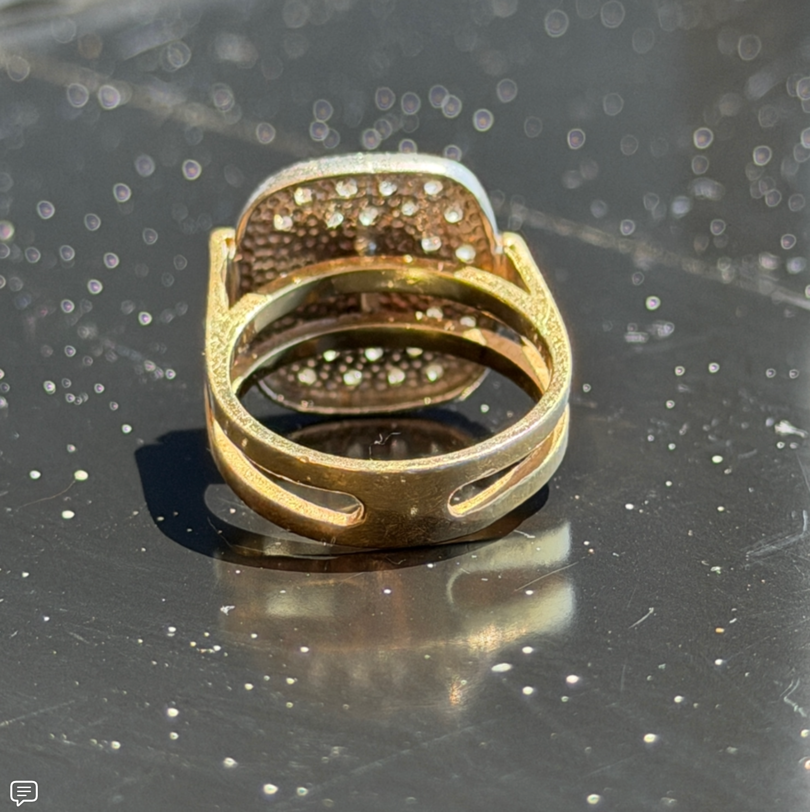 Vintage 14K Yellow Gold Double Band with Diamonds set on 14K White Gold. Really Cool design, almost looks like a belt buckle. We love anything cool and unique.