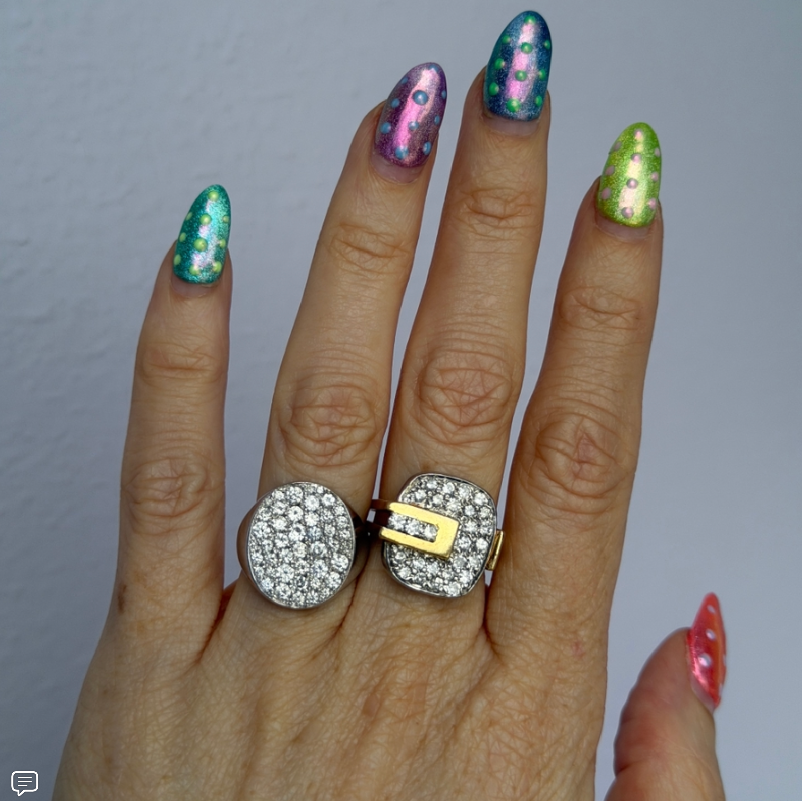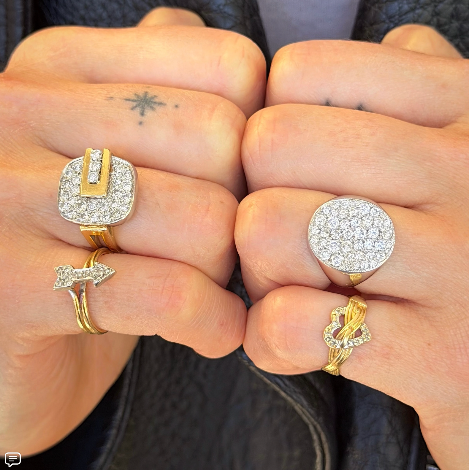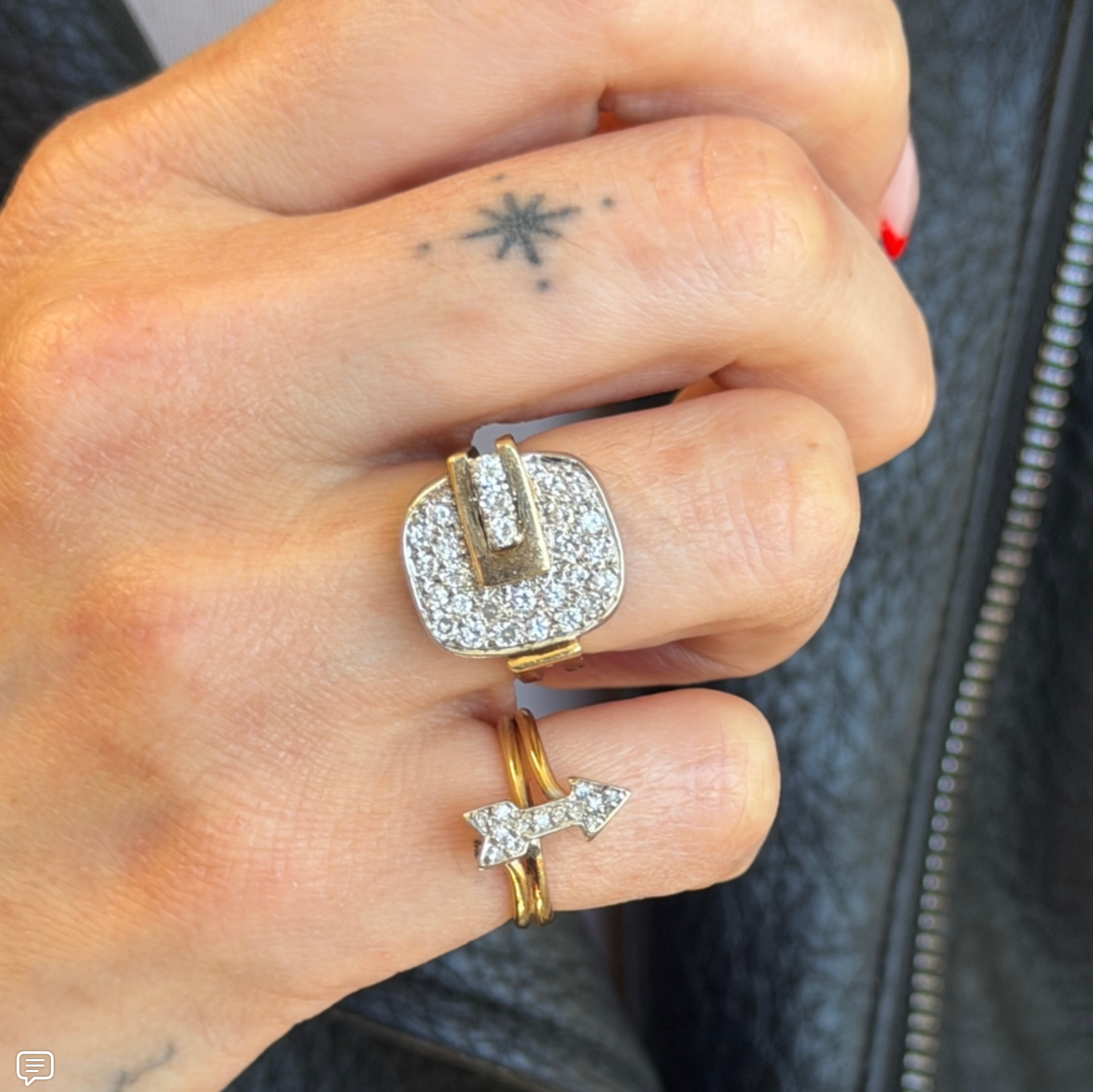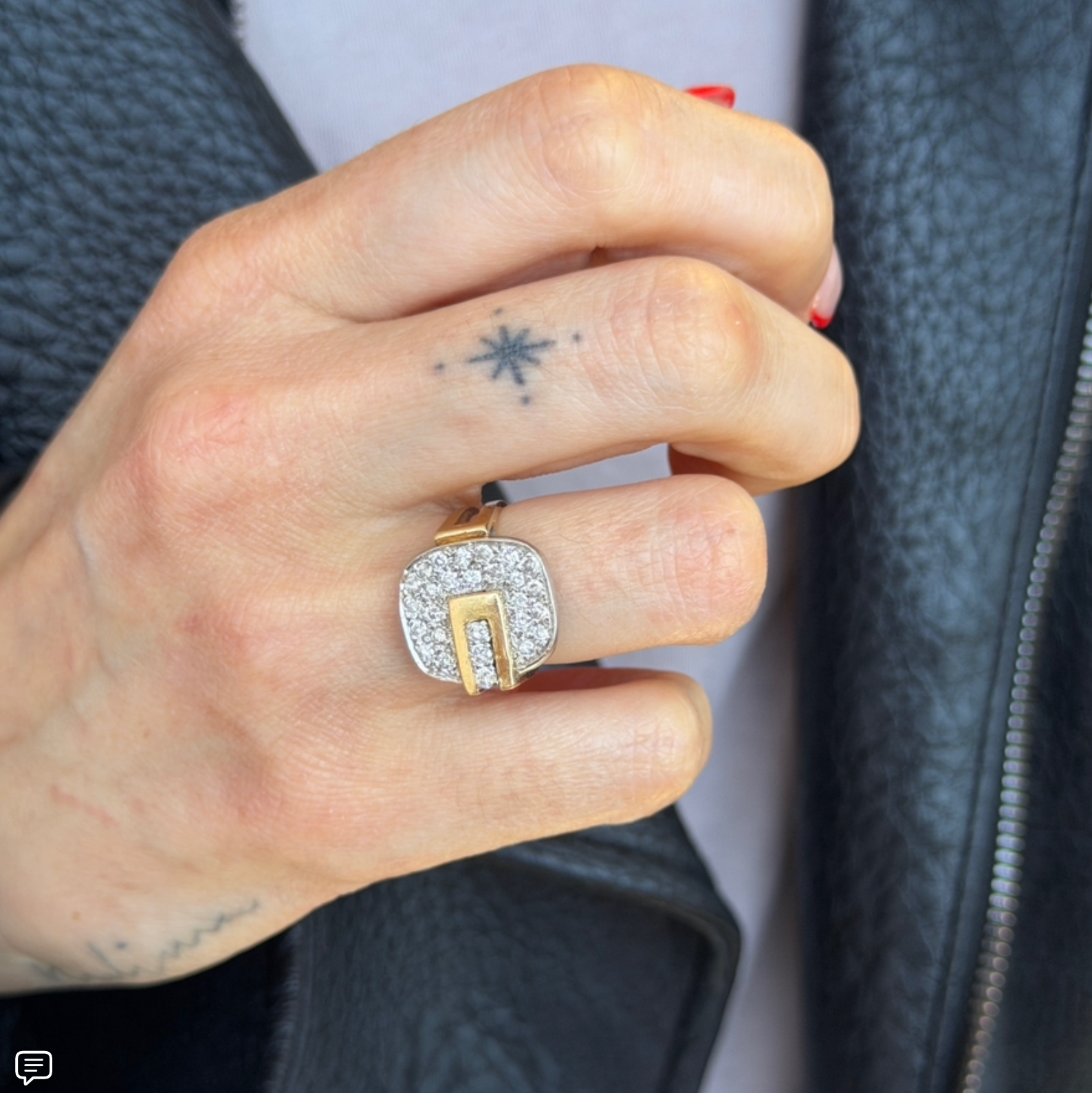Vintage 14K Yellow Gold Double Band with Diamonds set on 14K White Gold. Really Cool design, almost looks like a belt buckle. We love anything cool and unique.