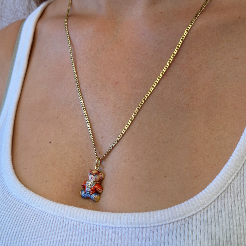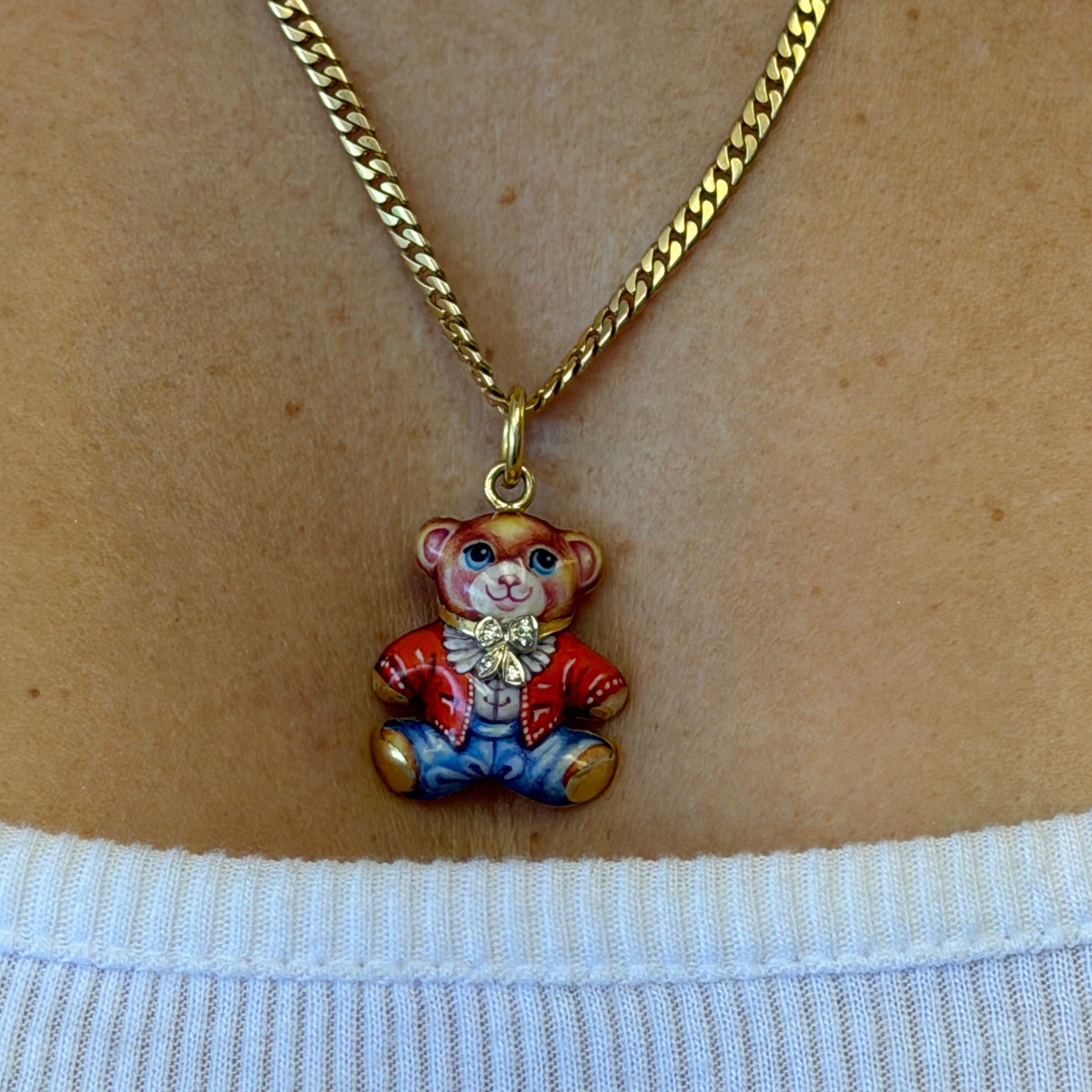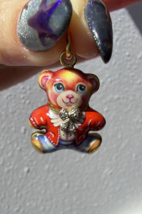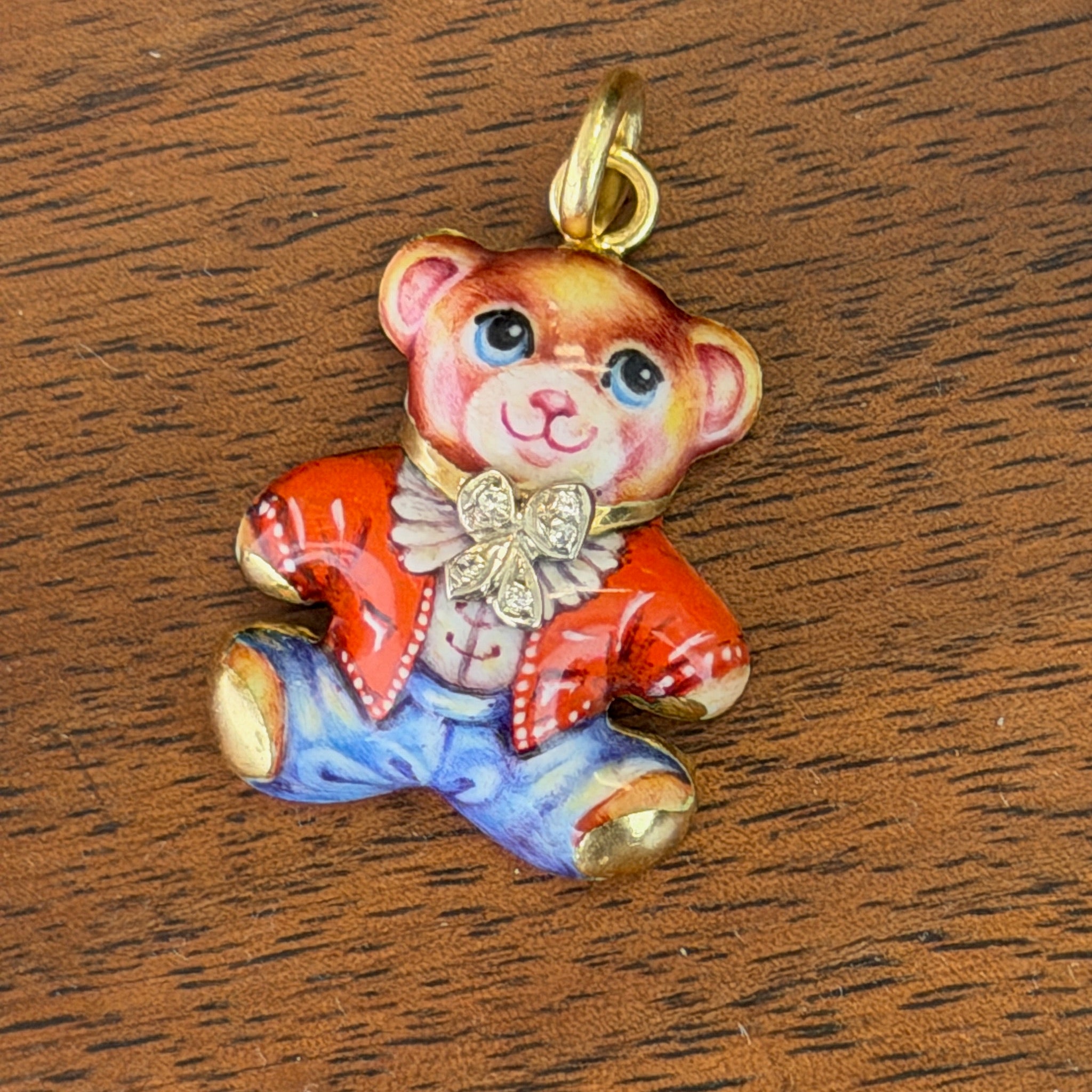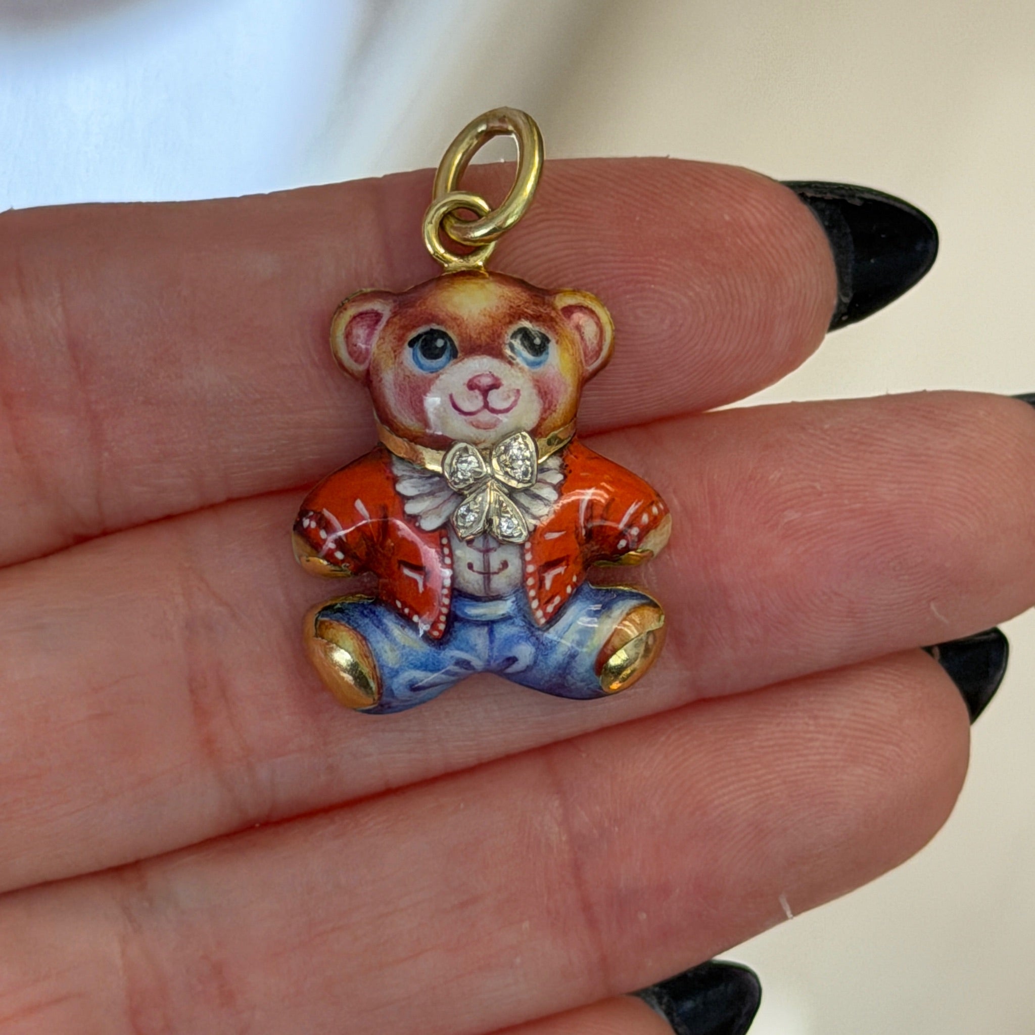 Enamel Teddy Bear Charm with Diamond Bow. The cutest Vintage 18K Yellow Gold Enamel Teddy Bear Charm with Diamond Bow. The enamel is in perfect condition.