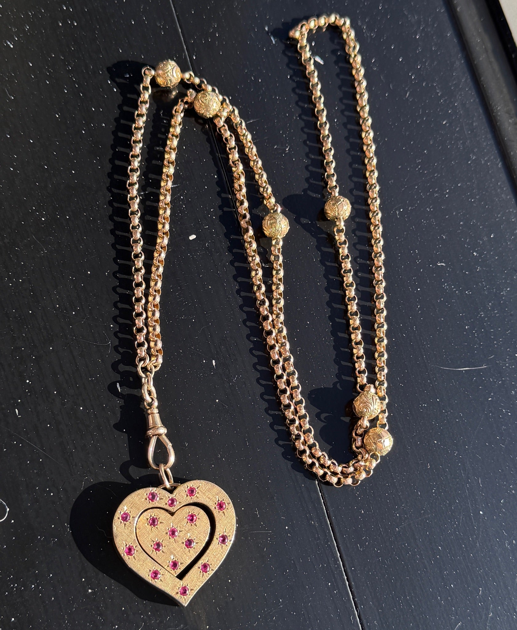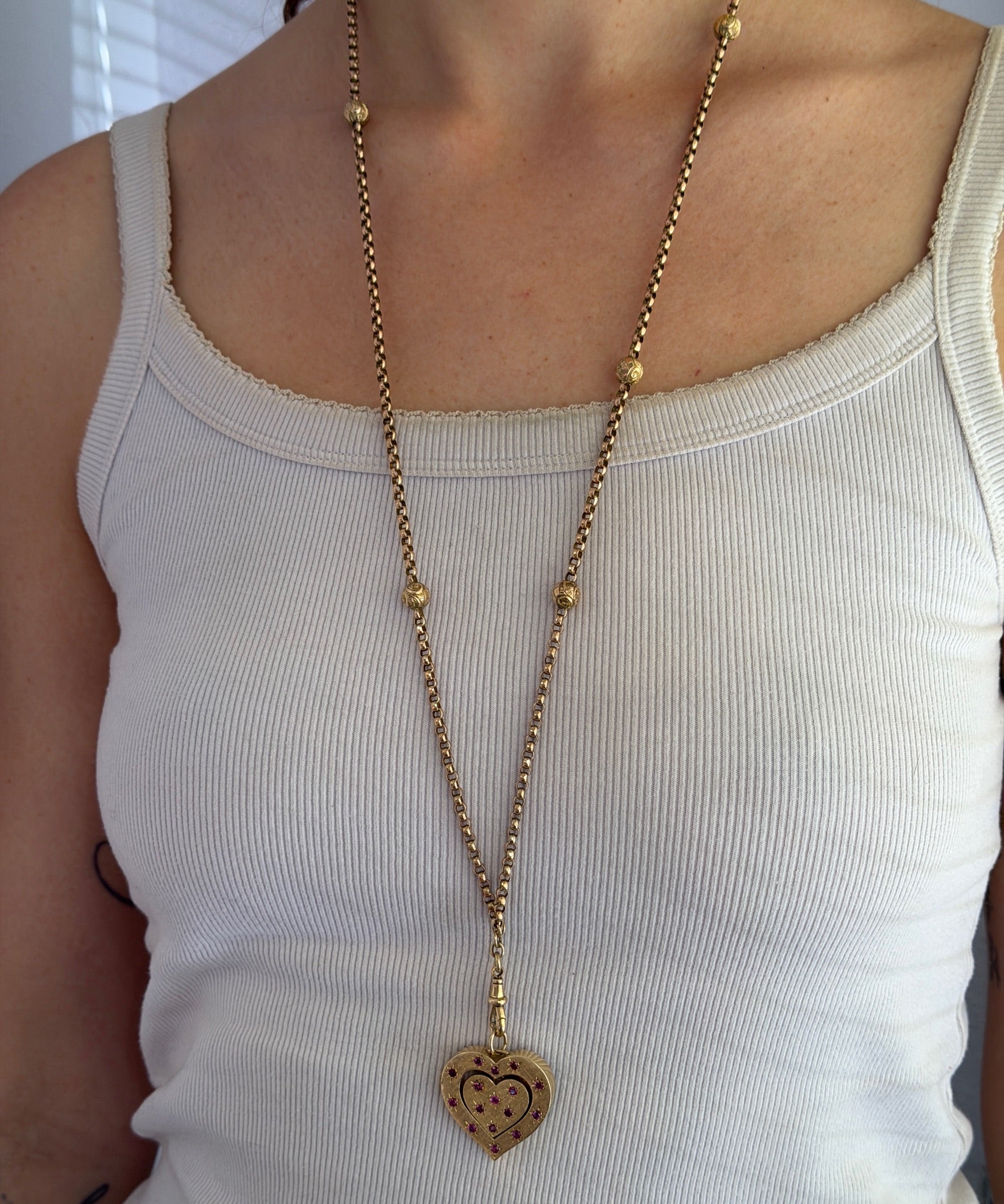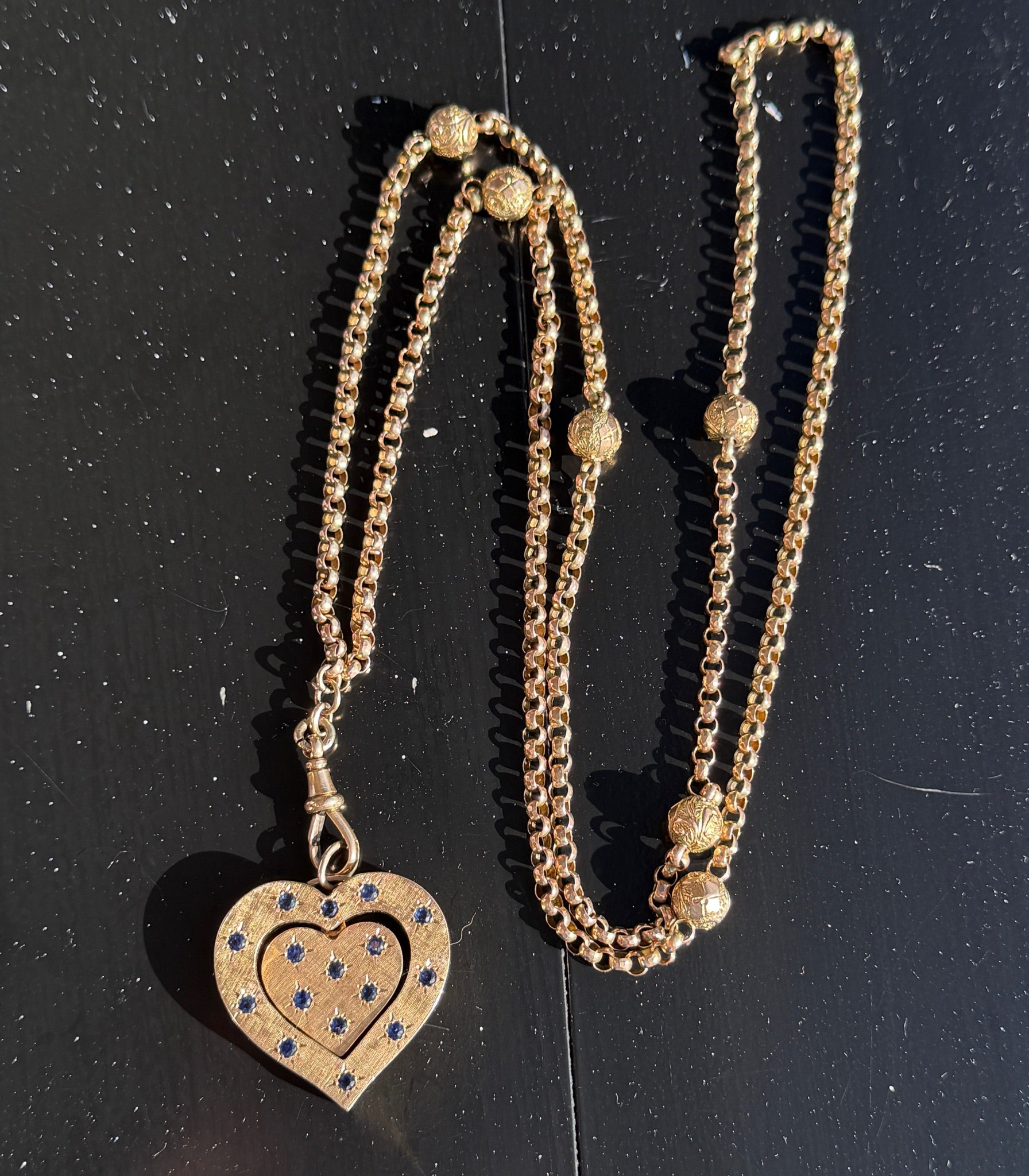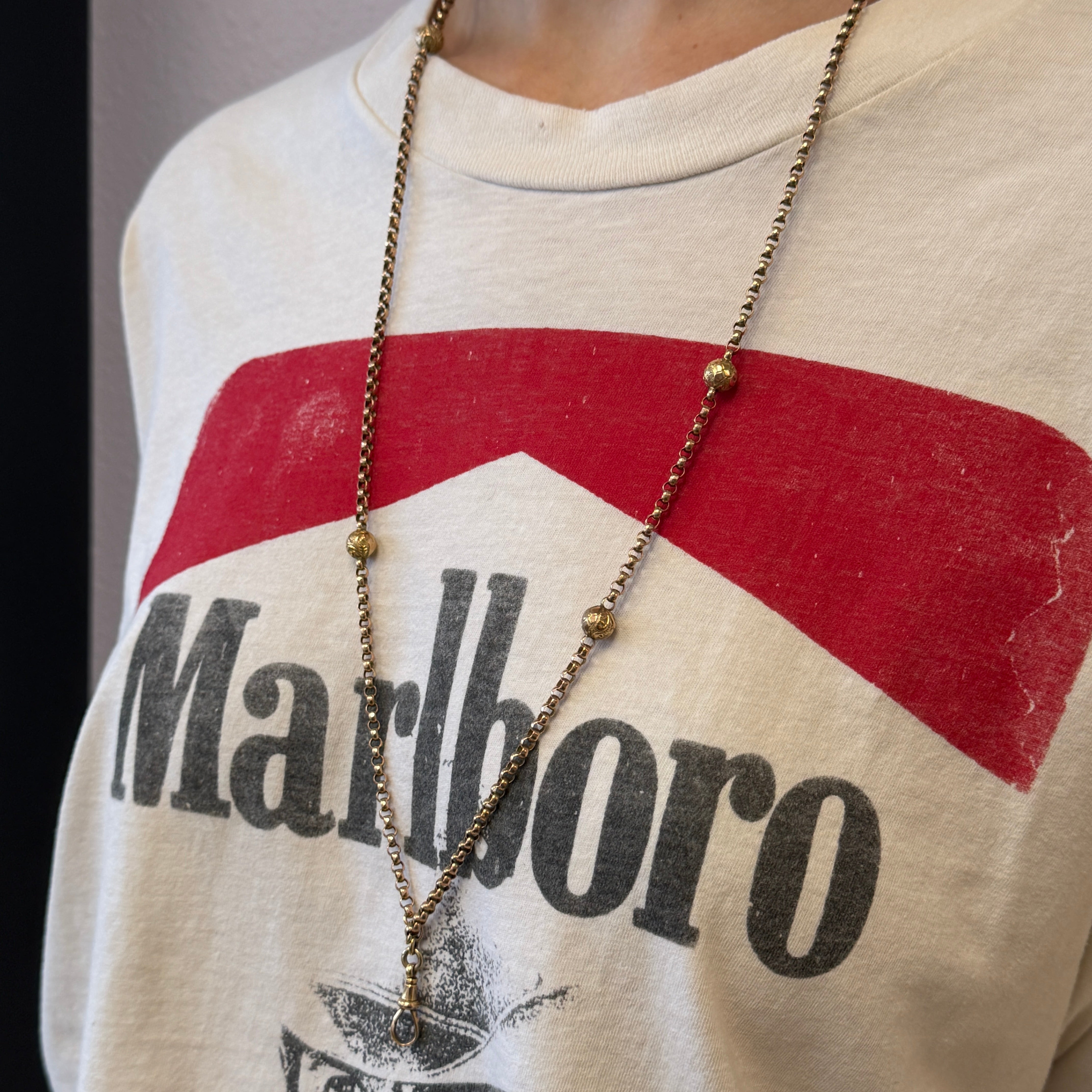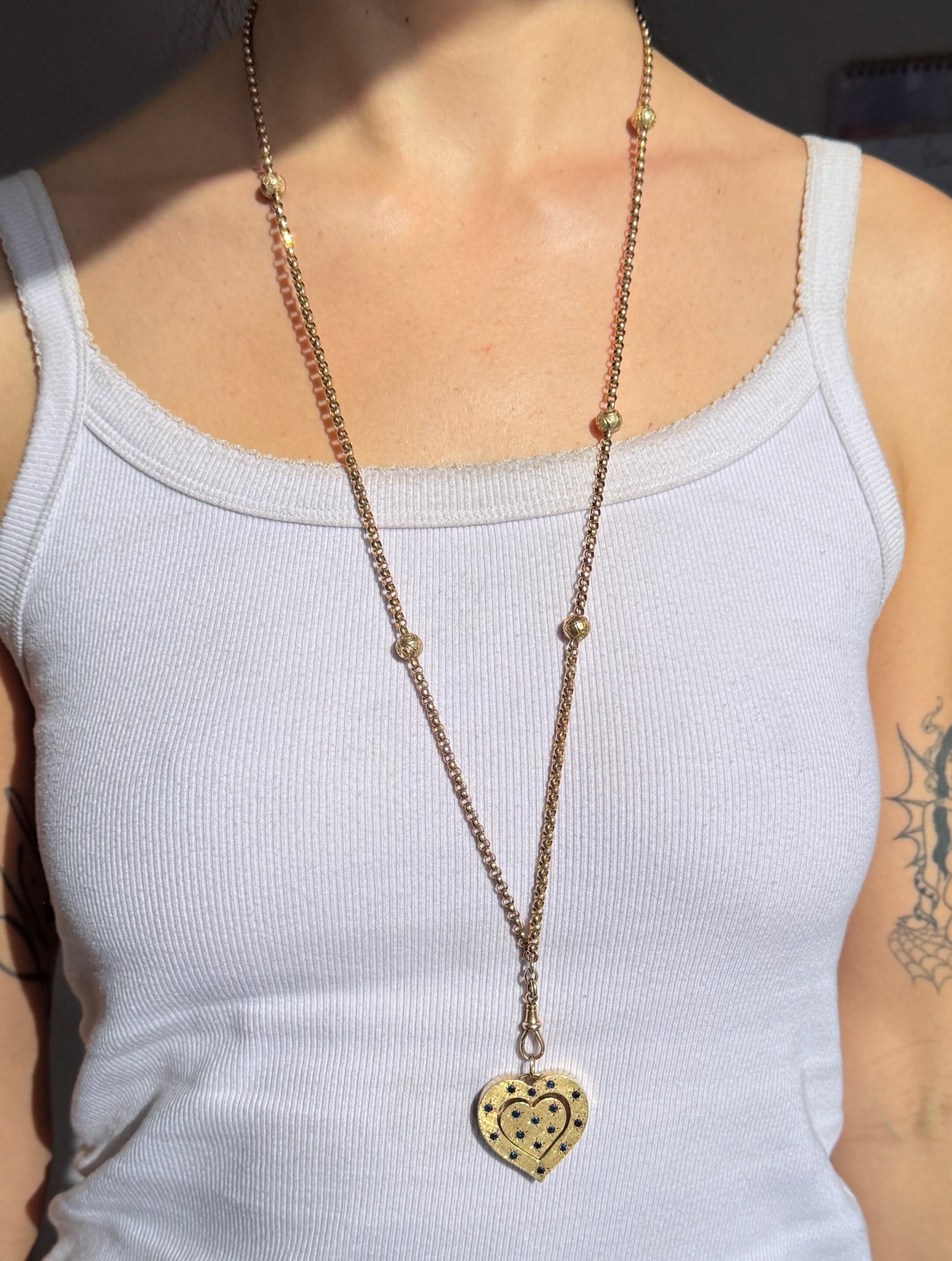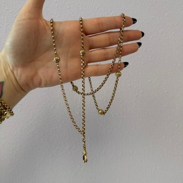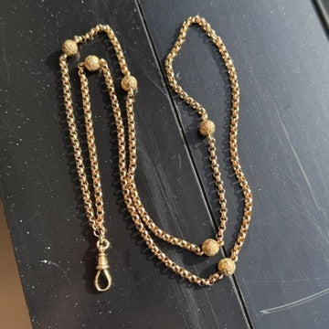 Antique 15K Yellow Gold Rolo Chain with Gold Balls and Dog Clip to Hang Pendants. Doesn't have a clasp, fits over your head.