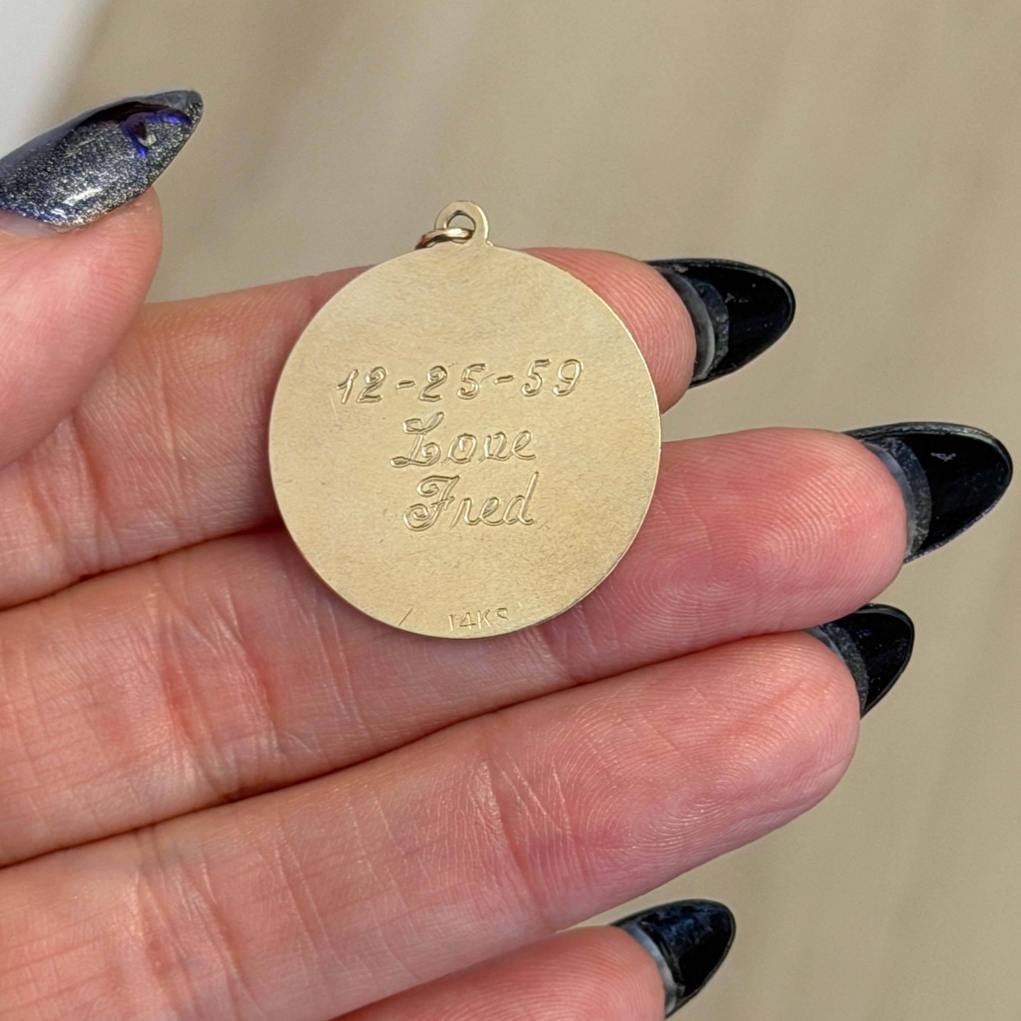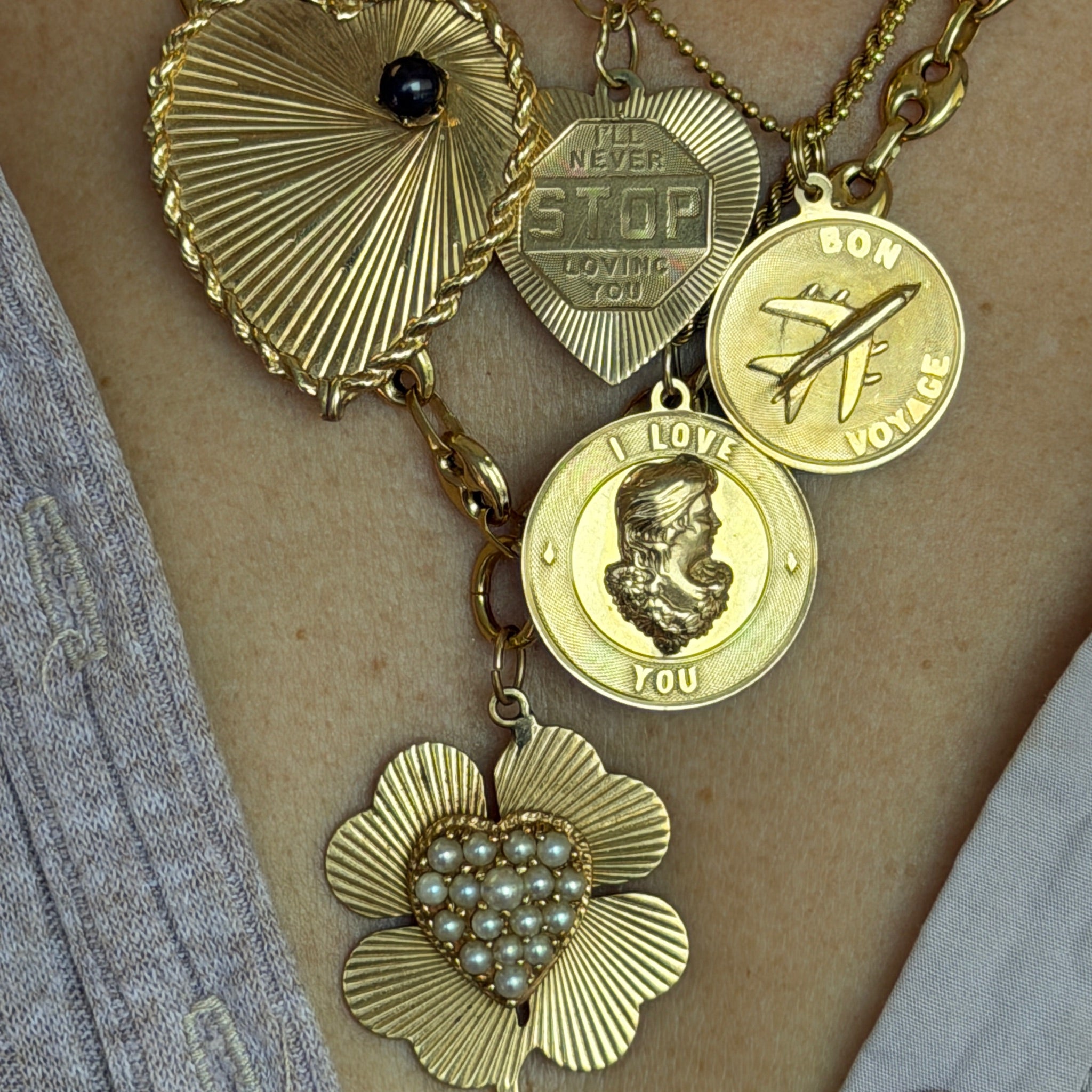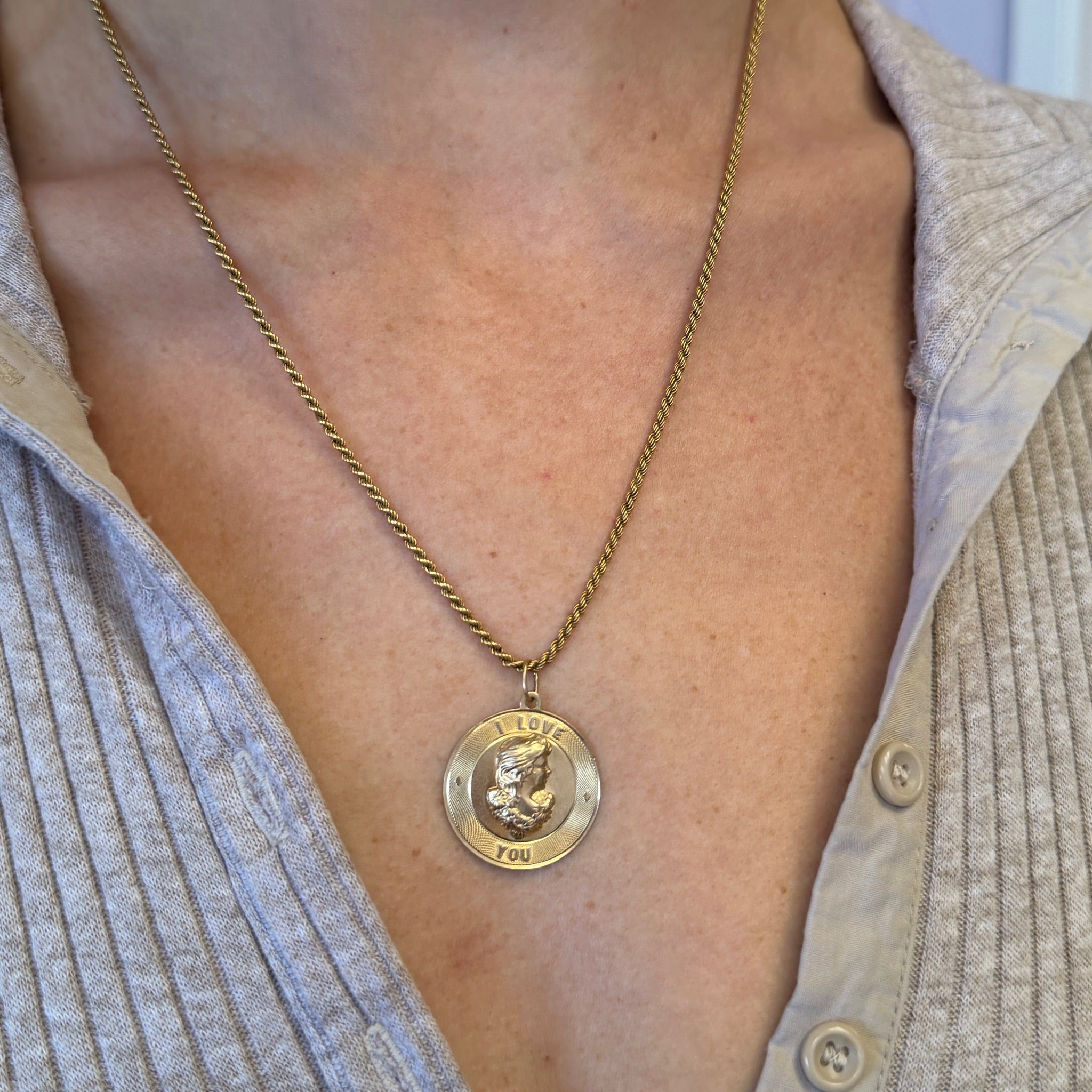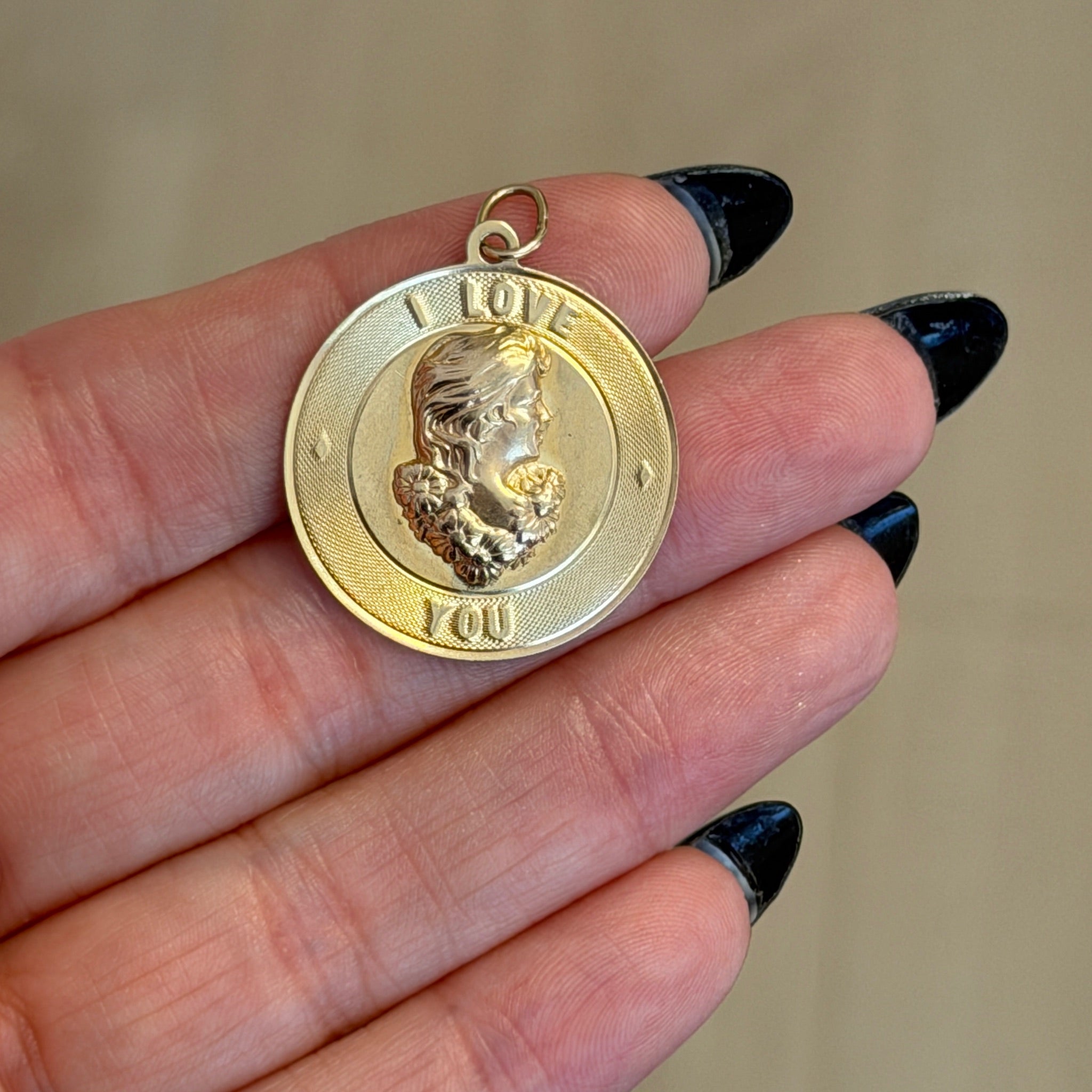 I love you Charm with Silhouette. Vintage 14K Yellow Gold Round Charm with Silhouette