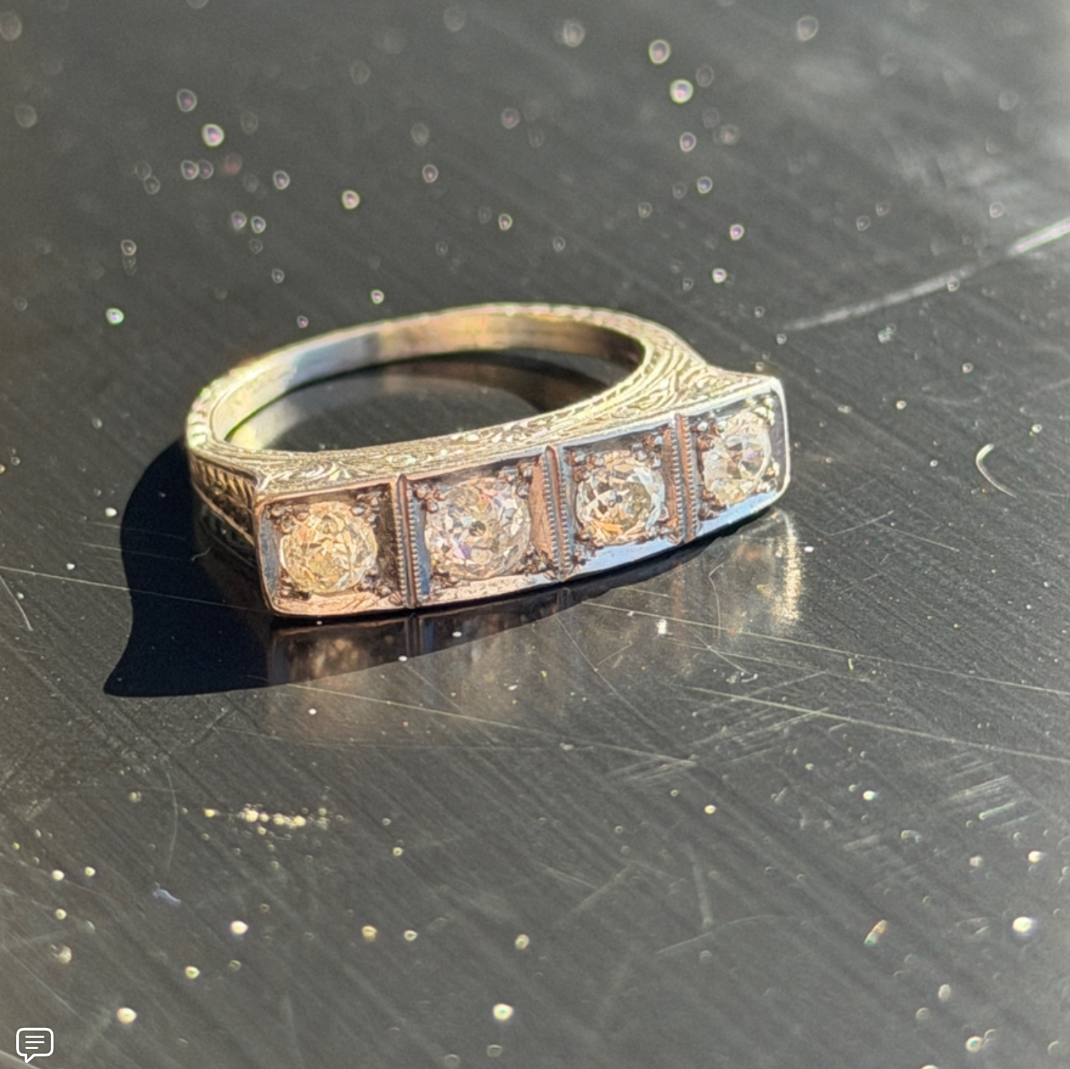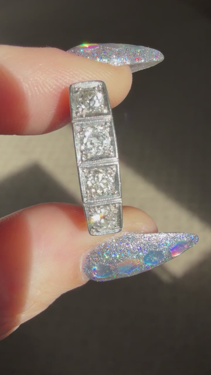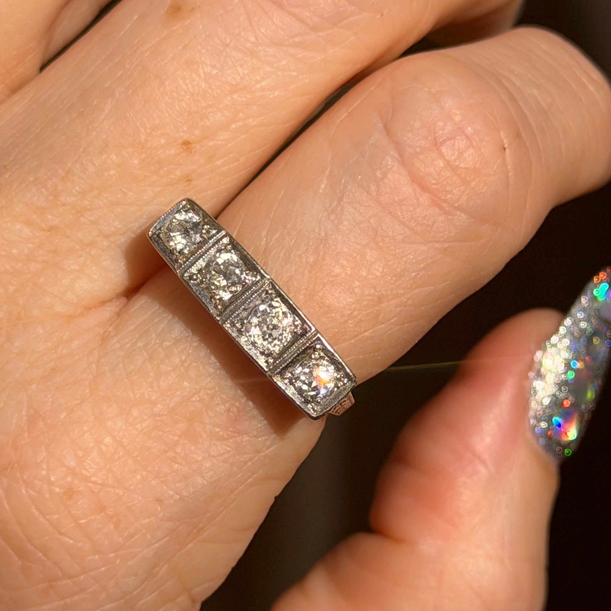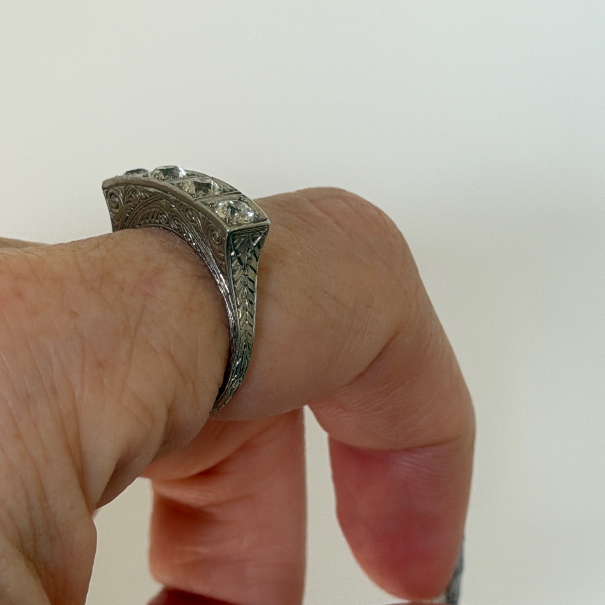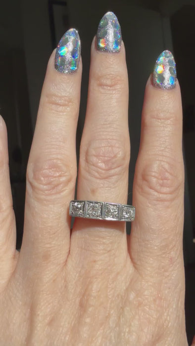 Antique Platinum Art Deco Ring with Four Old Mine Cut Diamonds
