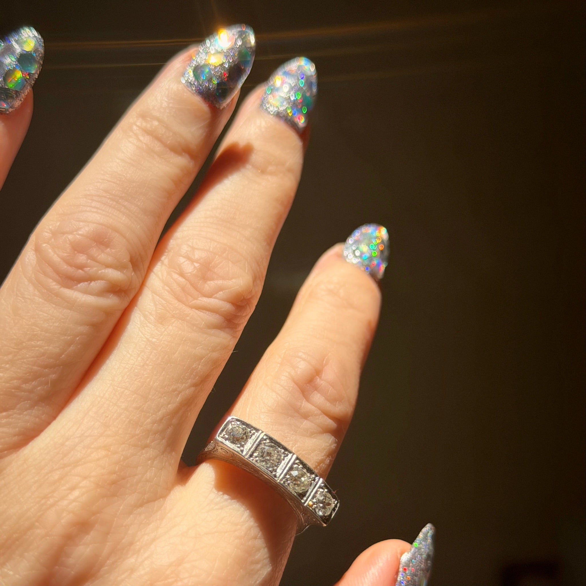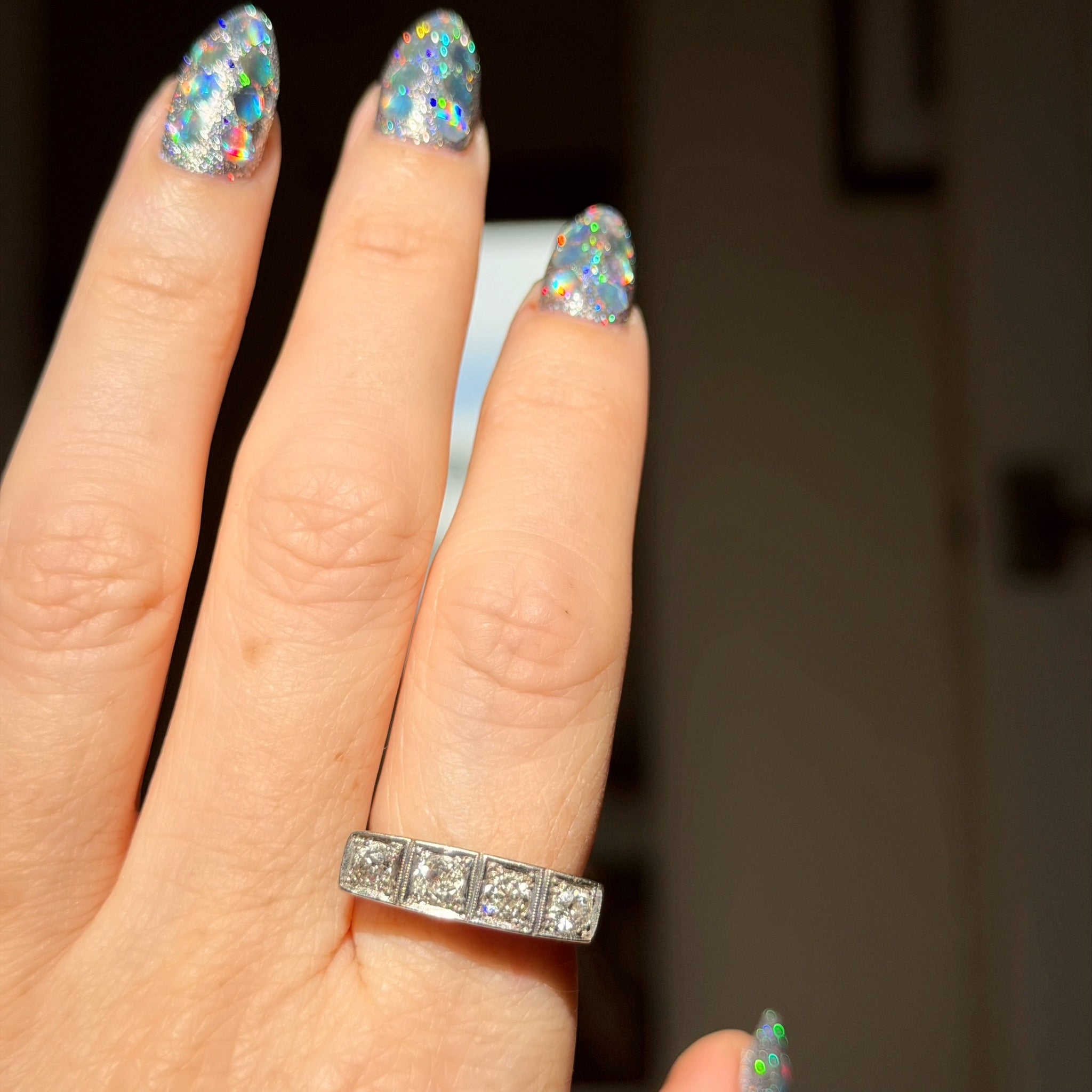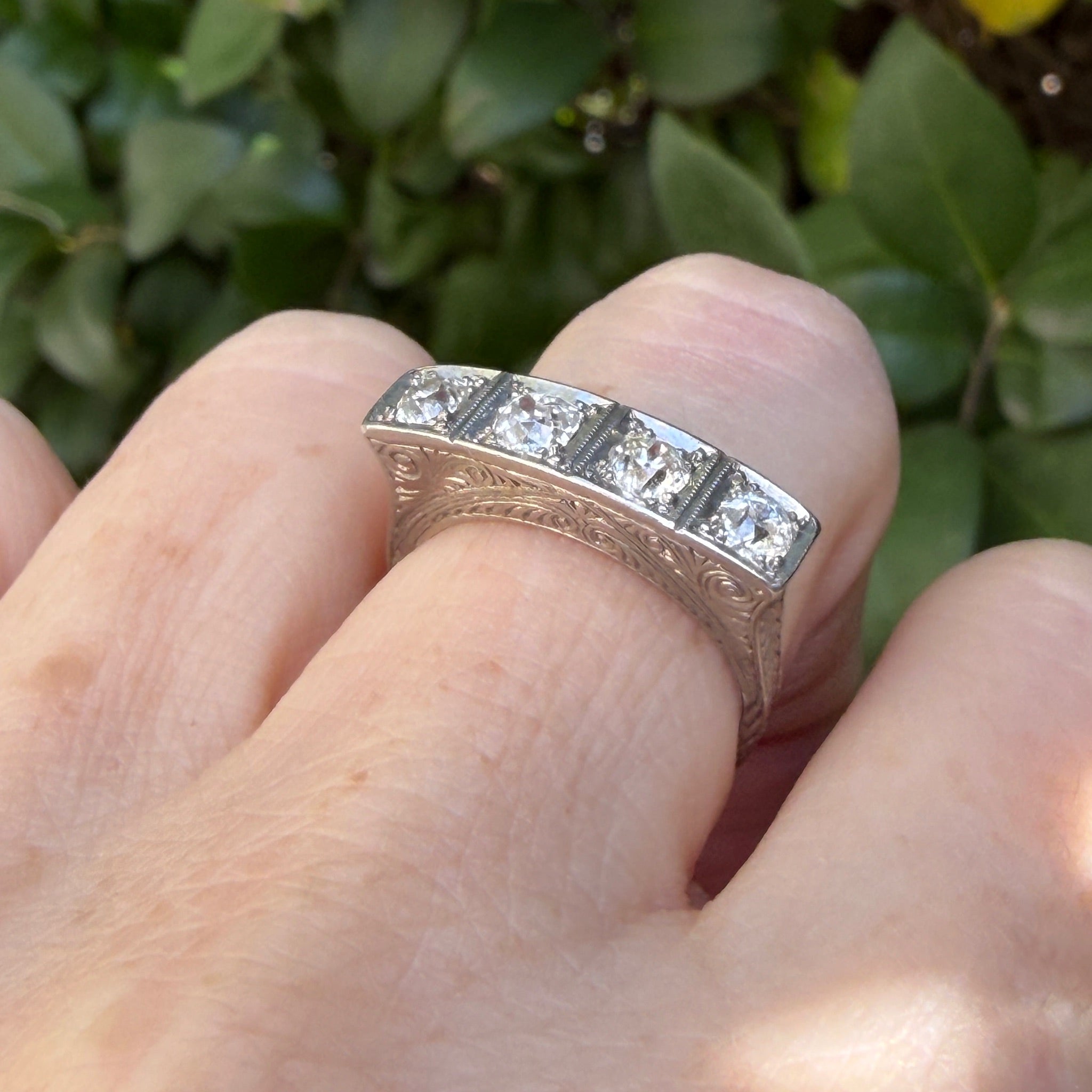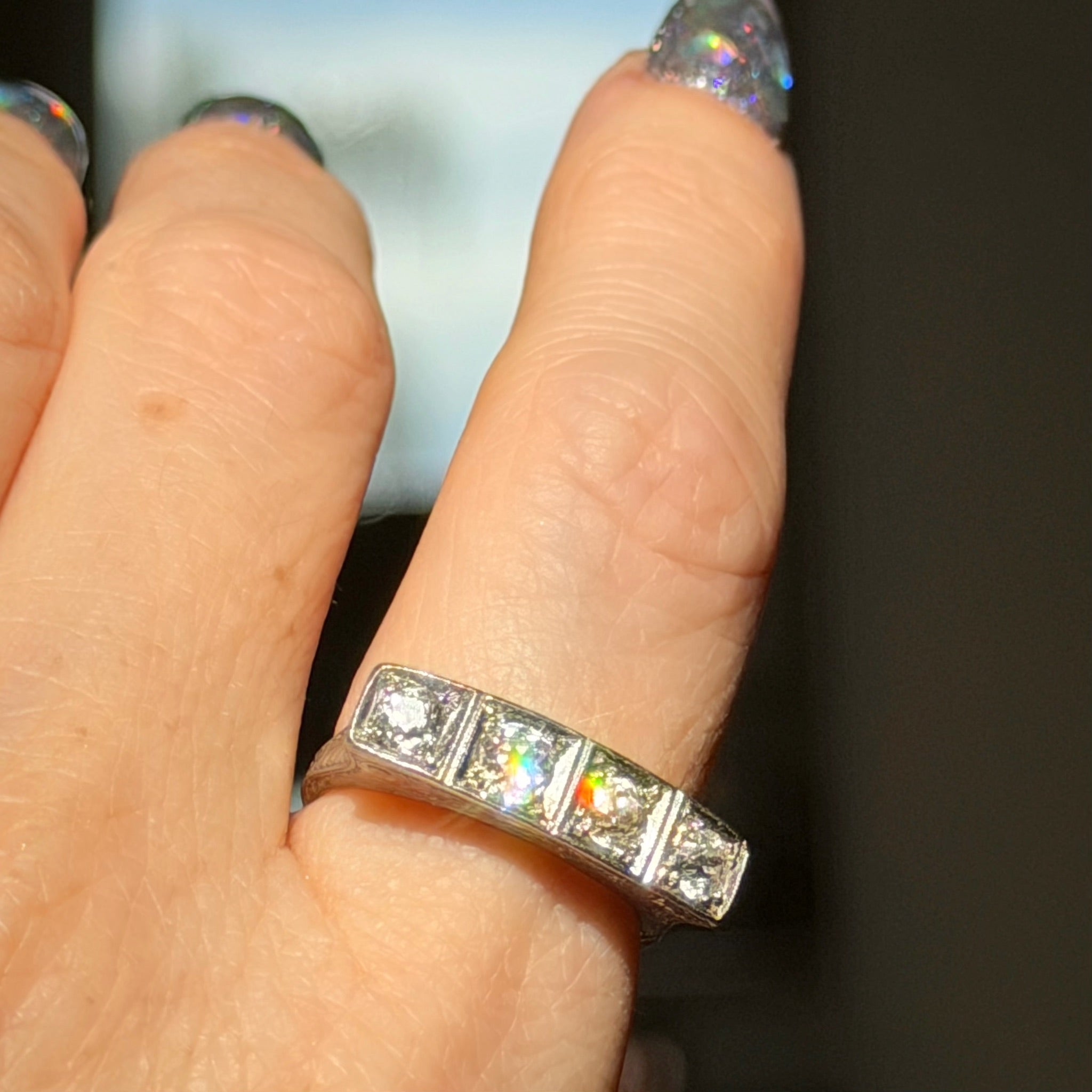 Antique Platinum Art Deco Ring with Four Old Mine Cut Diamonds